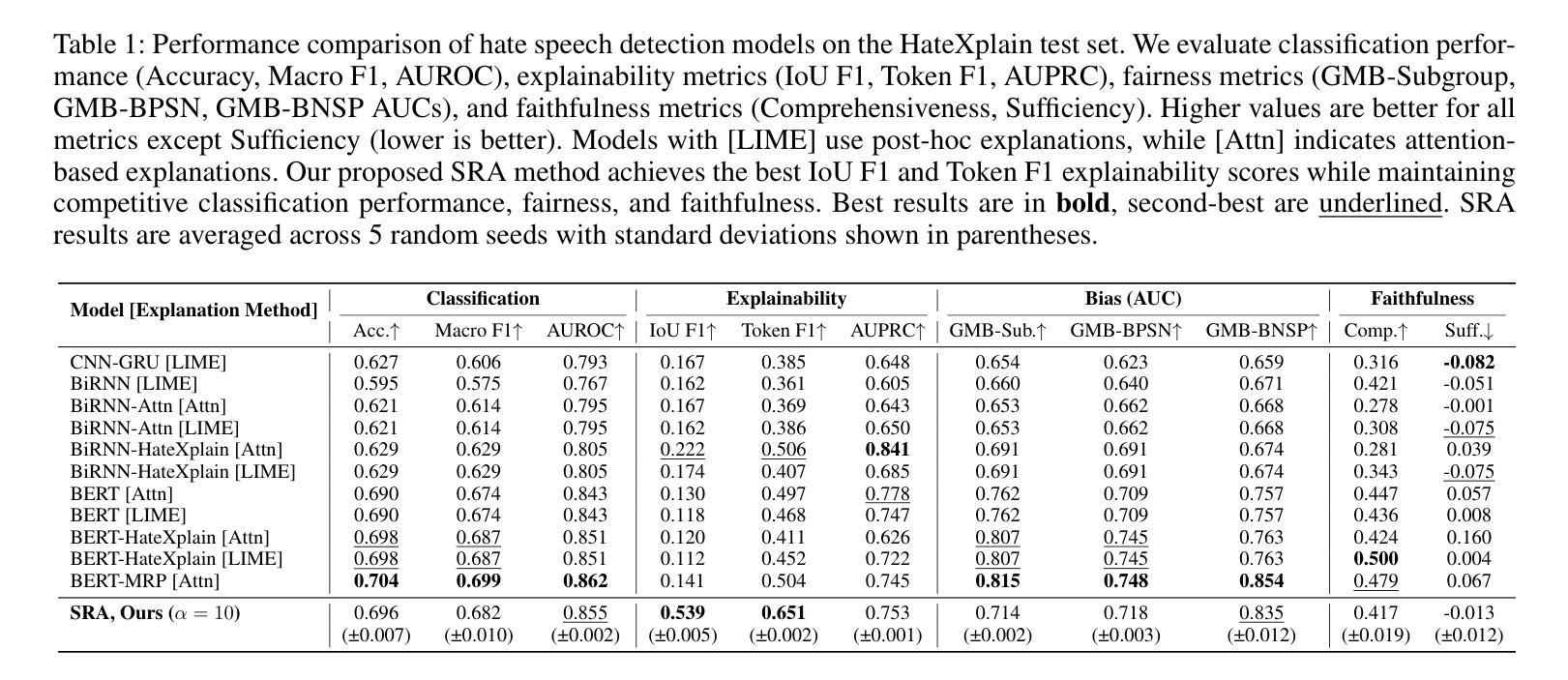 - SRA框架通过明确对齐模型注意力与人类理性,提高了仇恨言论分类中的可解释性和公平性。