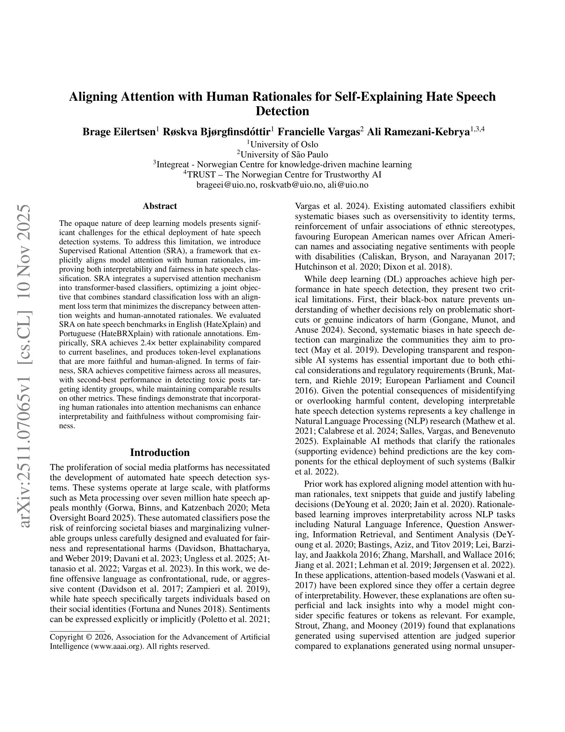 深度学习模型的模糊性为仇恨言论检测系统的道德部署带来了重大挑战。为了解决这一局限性,我们引入了监督理性注意力(SRA)框架,该框架显式地将模型注意力与人类理性对齐,从而提高了仇恨言论分类中的可解释性和公平性。SRA将监督注意力机制集成到基于变压器的分类器中,优化了一个联合目标,该目标结合了标准分类损失与对齐损失项,以最小化注意力权重与人类注释理由之间的差异。我们在英语(HateXplain)和葡萄牙语(HateBRXplain)的仇恨言论基准测试上对SRA进行了评估,这些基准测试都有理由注释。从实证结果来看,SRA与当前基线相比,可实现2.4倍的可解释性提升,并产生更忠实、更符合人类视角的标记级解释。在公平性方面,SRA在所有衡量标准上都表现出有竞争力的公平性,在检测针对身份群体的有毒帖子时表现居次席,同时在其他指标上保持相当的结果。这些发现表明,将人类理性纳入注意力机制可以提高可解释性和忠实性,而不损害公平性。