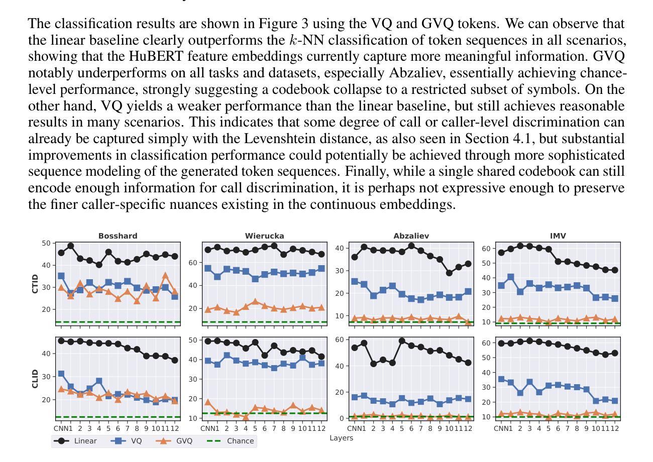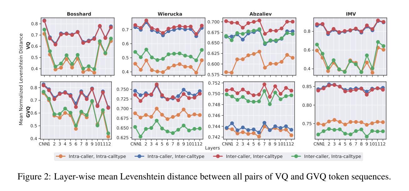 - 令牌序列能够区分不同的呼叫类型和呼叫者,这在四个生物声学数据集中得到了验证。