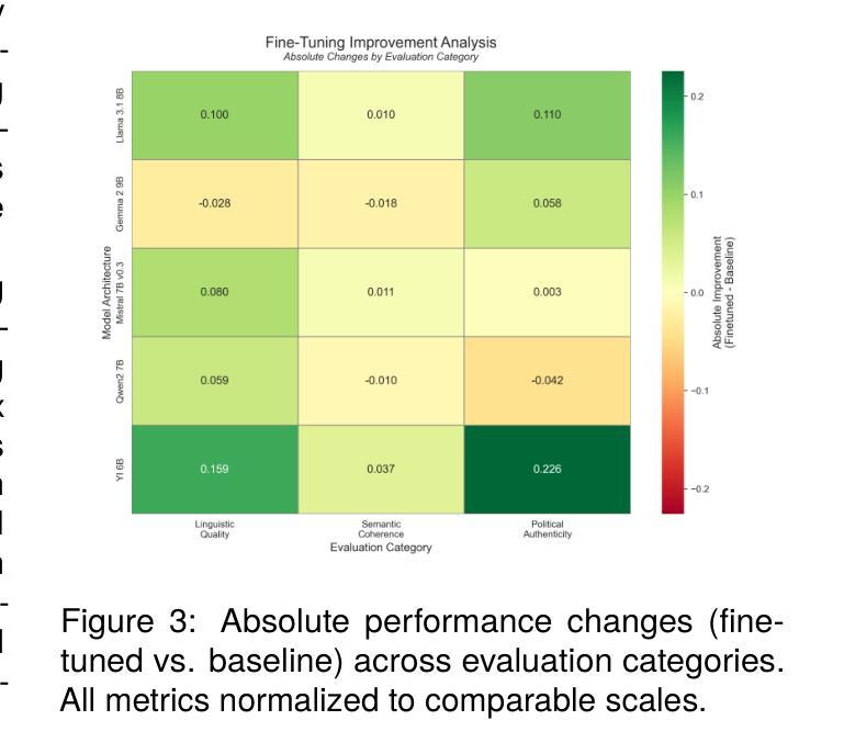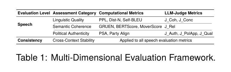 - 评估框架结合了计算指标和大型语言模型评估方法,涵盖语言质量、语义连贯性和政治真实性三个维度。