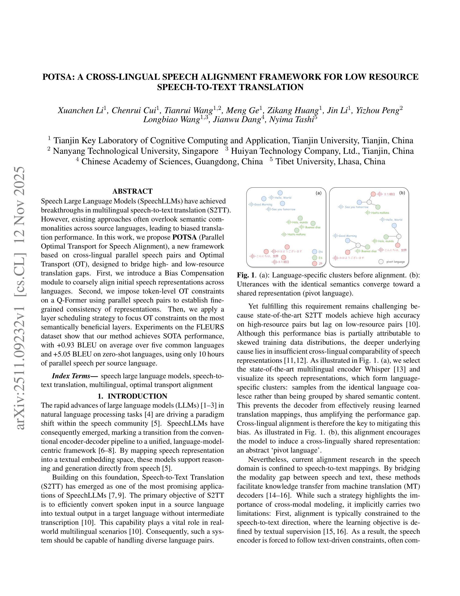 本文介绍了针对多语言语音到文本翻译(S2TT)领域存在的问题,提出了一种基于跨语言平行语音对和最优传输(OT)的新框架POTSA。该框架旨在解决高资源和低资源翻译之间的差距,通过引入偏差补偿模块进行初步语音表示对齐,在Q-Former上施加基于平行语音对的标记级OT约束,并建立精细表示一致性。实验表明,该方法在FLEURS数据集上达到了最先进性能,五种常见语言的BLEU得分平均提高+0.93,零镜头语言提高+5.05 BLEU。