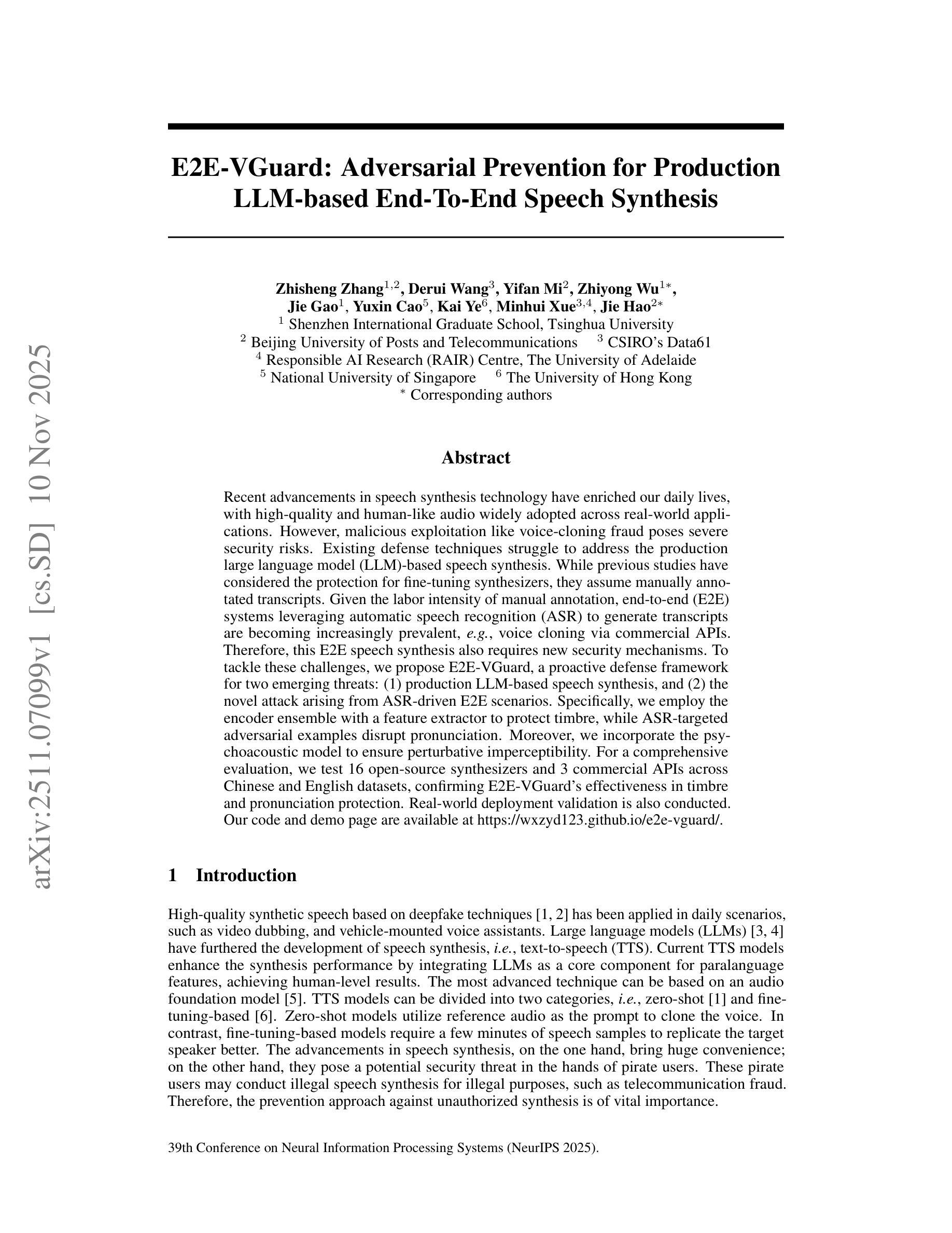 - 近期语音合成技术发展迅速,但恶意利用如语音克隆欺诈带来了安全风险。