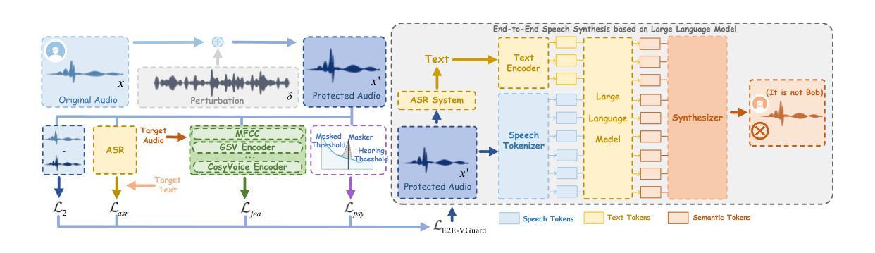 Recent advancements in speech synthesis technology have enriched our daily lives, with high-quality and human-like audio widely adopted across real-world applications. However, malicious exploitation like voice-cloning fraud poses severe security risks. Existing defense techniques struggle to address the production large language model (LLM)-based speech synthesis. While previous studies have considered the protection for fine-tuning synthesizers, they assume manually annotated transcripts. Given the labor intensity of manual annotation, end-to-end (E2E) systems leveraging automatic speech recognition (ASR) to generate transcripts are becoming increasingly prevalent, e.g., voice cloning via commercial APIs. Therefore, this E2E speech synthesis also requires new security mechanisms. To tackle these challenges, we propose E2E-VGuard, a proactive defense framework for two emerging threats: (1) production LLM-based speech synthesis, and (2) the novel attack arising from ASR-driven E2E scenarios. Specifically, we employ the encoder ensemble with a feature extractor to protect timbre, while ASR-targeted adversarial examples disrupt pronunciation. Moreover, we incorporate the psychoacoustic model to ensure perturbative imperceptibility. For a comprehensive evaluation, we test 16 open-source synthesizers and 3 commercial APIs across Chinese and English datasets, confirming E2E-VGuard’s effectiveness in timbre and pronunciation protection. Real-world deployment validation is also conducted. Our code and demo page are available at https://wxzyd123.github.io/e2e-vguard/.