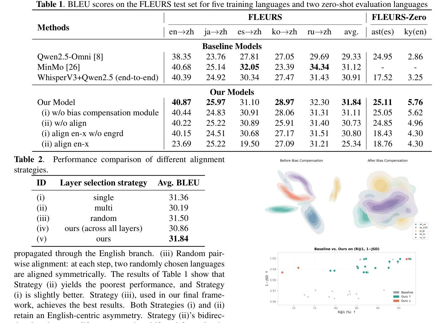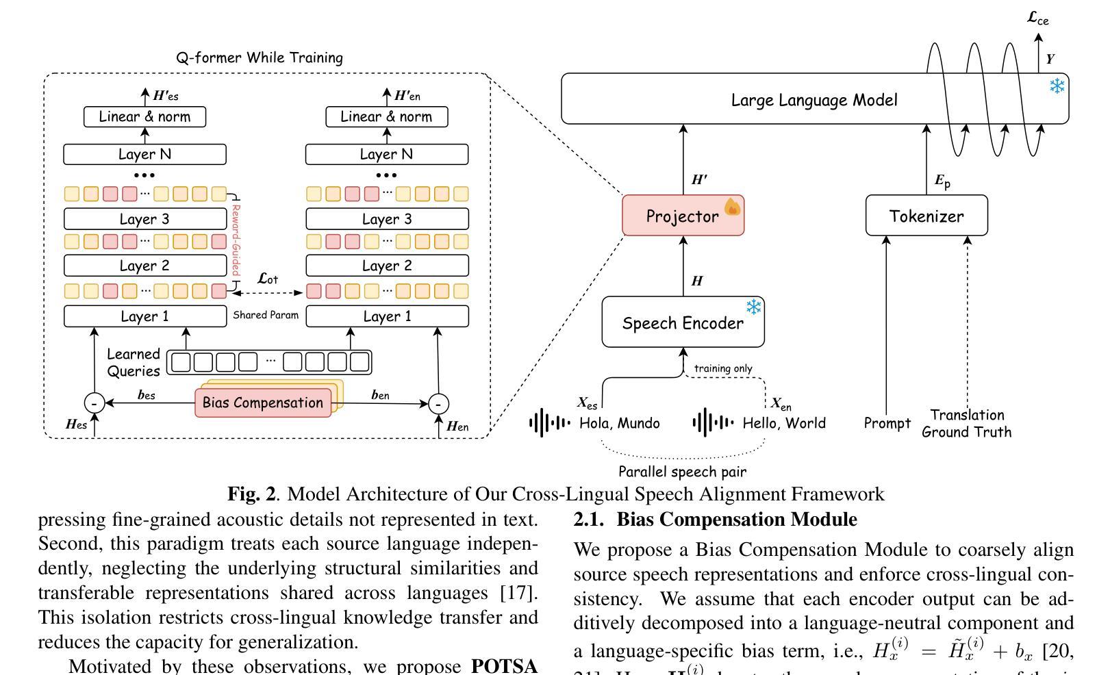 语音大语言模型(SpeechLLMs)在多语种语音到文本的翻译(S2TT)方面取得了突破。然而,现有方法往往忽视了源语言之间的语义共性,导致翻译性能存在偏见。在这项工作中,我们提出了基于跨语言平行语音对和最优传输(OT)的POTSA(并行最优传输语音对齐)新框架,旨在弥高资源和低资源翻译之间的差距。首先,我们引入了一个偏见补偿模块,粗略地对跨语言的初始语音表示进行对齐。其次,我们对使用平行语音对的Q-Former施加token级别的OT约束,以建立表示的精粒度一致性。然后,我们应用层调度策略,将OT约束集中在语义上最有益的图层上。在FLEURS数据集上的实验表明,我们的方法达到了最先进的性能,在五种常见语言上平均提高了+0.93个BLEU分,在零样本语言上提高了+5.05个BLEU分,且仅使用每源语言10小时的平行语音数据。