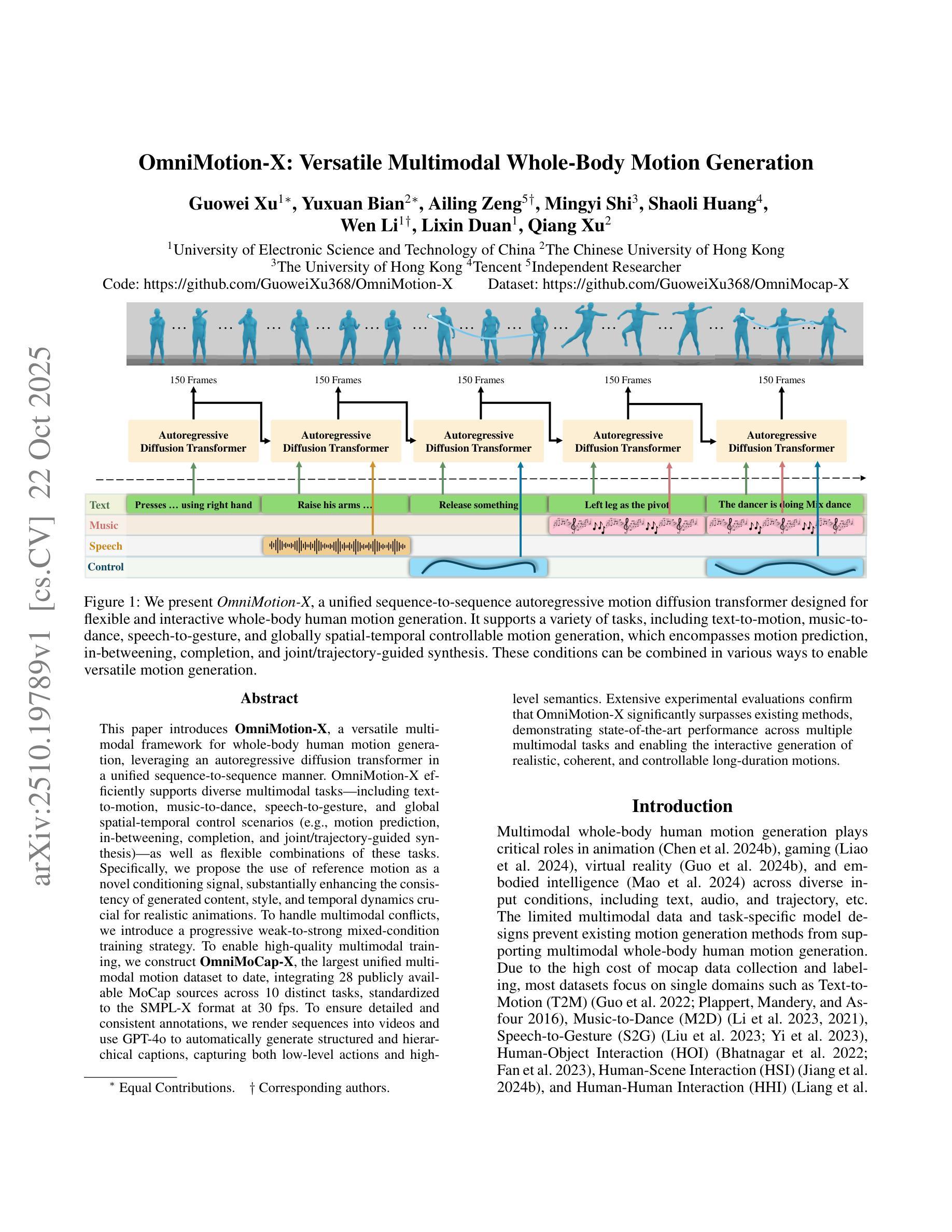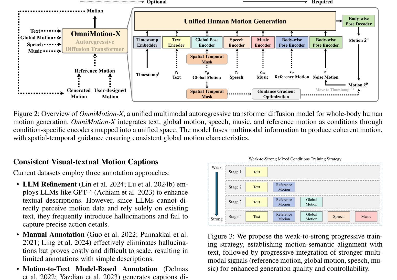本文介绍了OmniMotion-X,这是一个通用多模式框架,以统一序列到序列的方式,采用自回归扩散变压器,用于生成全身人体运动。OmniMotion-X高效支持多种多模式任务,包括文本到运动、音乐到舞蹈、语音到手势,以及全局时空控制场景(如运动预测、中间帧生成、补全和关节/轨迹引导合成等),以及这些任务的灵活组合。具体来说,我们提出使用参考运动作为新型条件信号,这大大提高了生成内容的一致性、风格和时空动态,对于现实动画至关重要。为了解决多模式冲突,我们引入了从弱到强的渐进式混合条件训练策略。为了进行高质量的多模式训练,我们构建了迄今为止最大的统一多模式运动数据集OmniMoCap-X,集成了10个不同任务的28个公开可用的MoCap源,以标准化的SMPL-X格式和30fps的频率呈现。为了确保详细和一致的注释,我们将序列呈现为视频,并使用GPT-4o自动生成结构和层次化的字幕,捕捉低级别动作和高级别语义。广泛的实验评估证实,OmniMotion-X显著超越了现有方法,在多个多模式任务上达到了最先进的性能,能够实现交互式生成逼真、连贯和可控的长期运动。