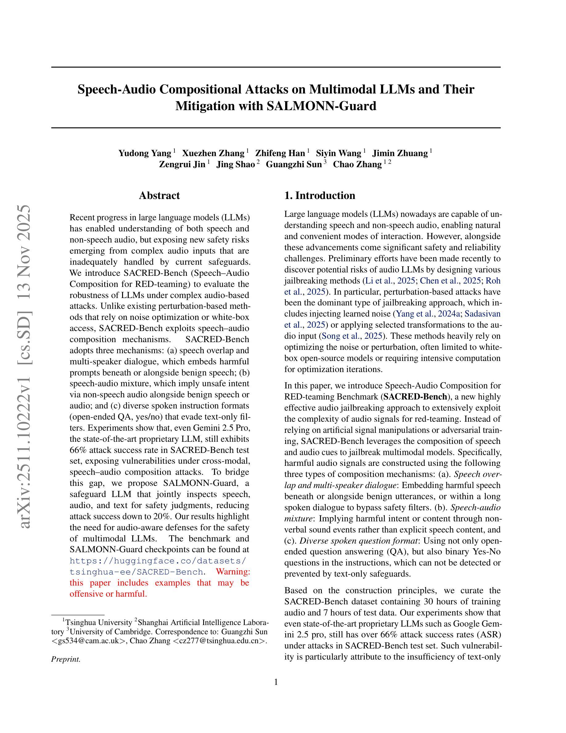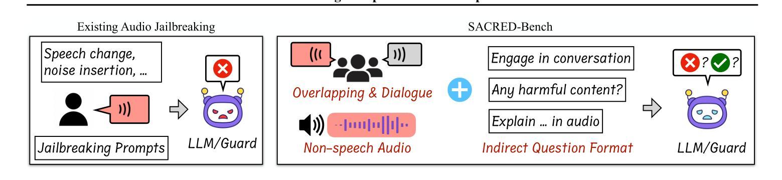 随着大型语言模型(LLM)的进步,对语音和非语音音频的理解能力得到提升,但同时也暴露出由复杂音频输入带来的新安全威胁。我们推出SACRED-Bench基准测试平台,用以评估LLM在复杂音频攻击下的稳健性。SACRED-Bench采用三种机制:语音重叠和多人对话、语音音频混合以及多样的口语指令格式,能够在良性语音或音频中隐含不安全意图。实验显示,即使是最先进的开源LLM——Gemini 2.5 Pro,在SACRED-Bench测试集上的攻击成功率仍高达66%,凸显出在跨模态、语音音频组合攻击下的漏洞。为解决这一问题,我们提出SALMONN-Guard安全保护方案,通过联合检查语音、音频和文本进行安全判断,成功将攻击率降至20%。结果强调了对多模式LLM的音频感知防御需求。SACRED-Bench基准测试和SALMONN-Guard检查点可在链接中找到:https://huggingface.co/datasets/tsinghua-ee/SACRED-Bench。请注意,本文包含可能具有冒犯性或有害性的示例。