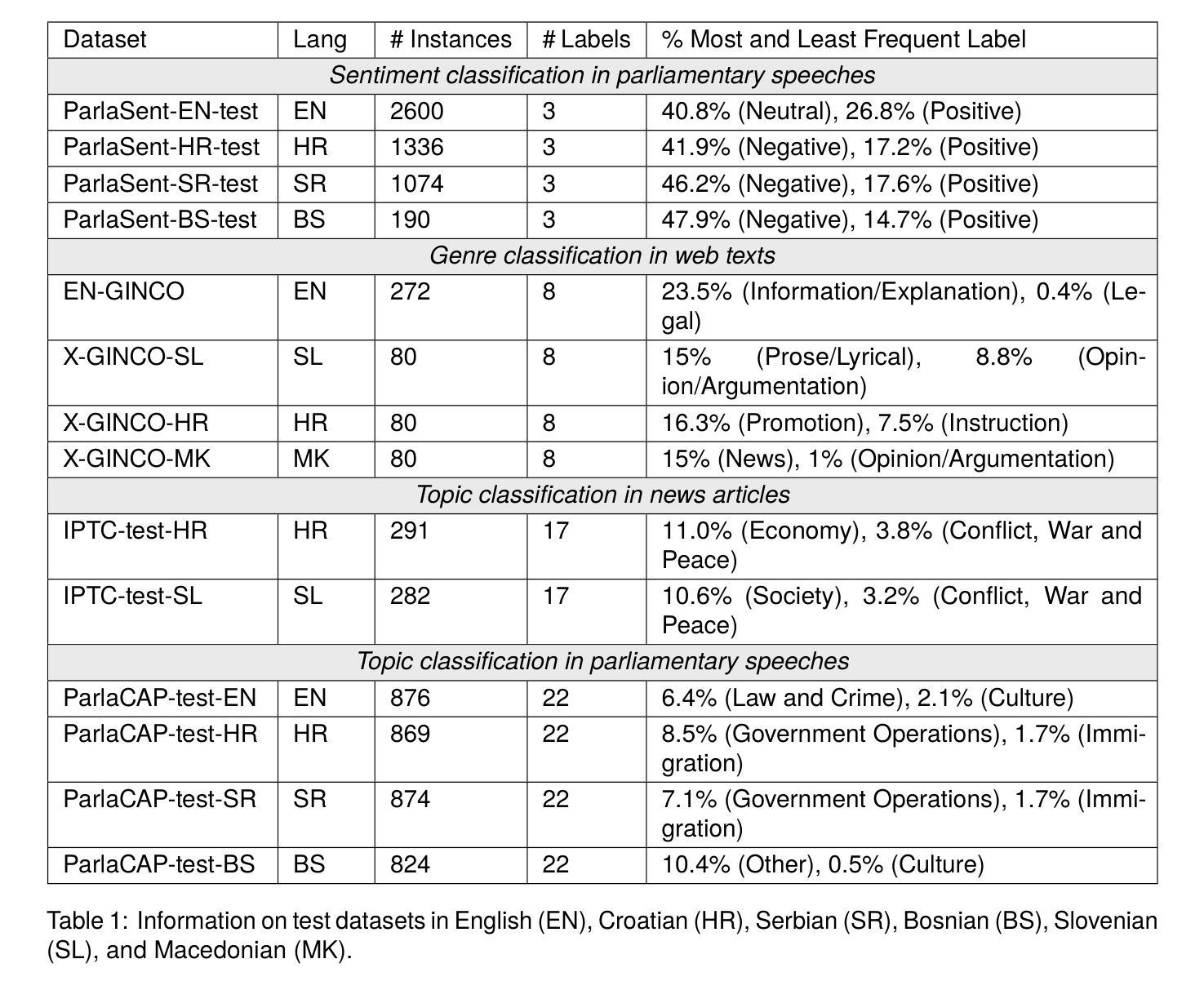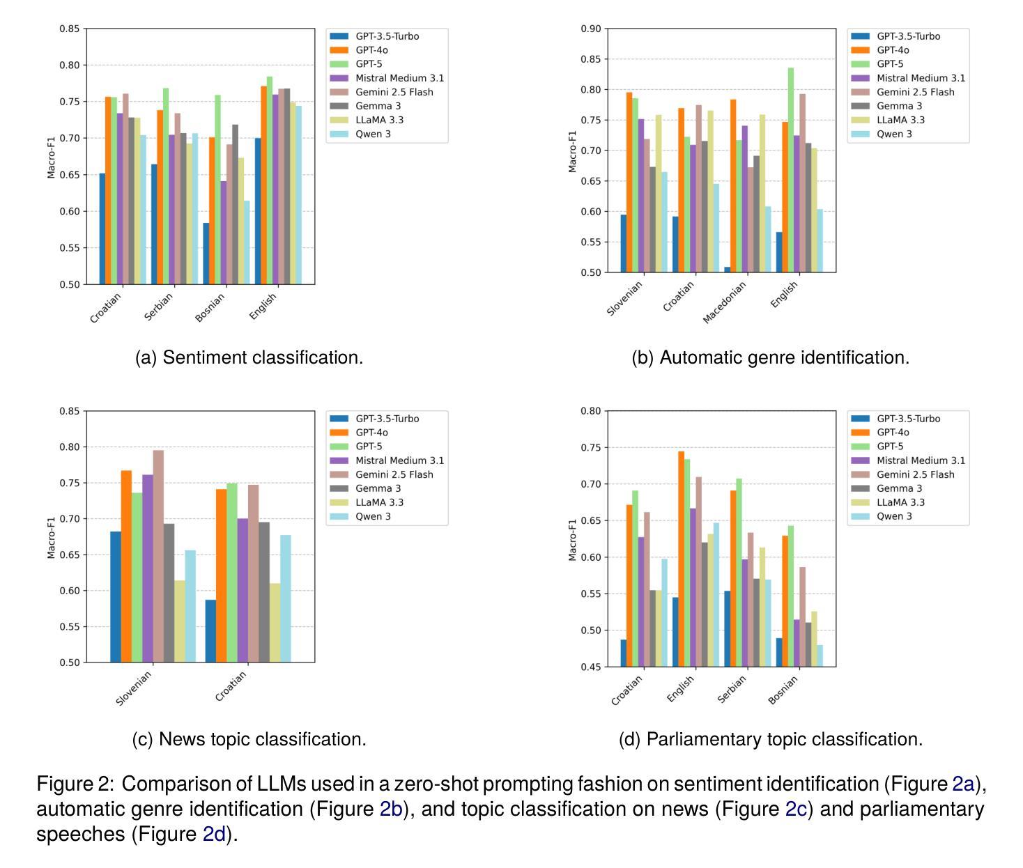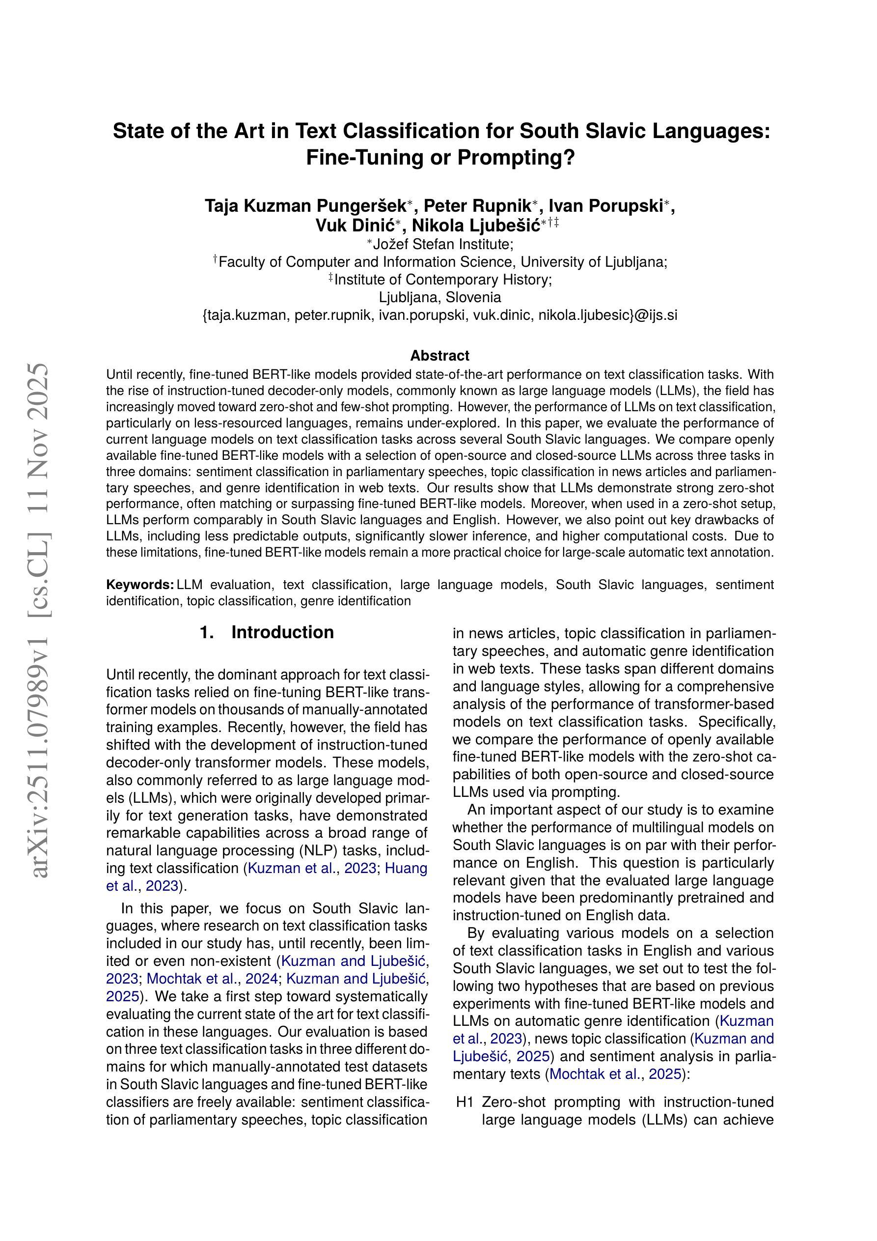 大型语言模型(LLMs)在文本分类任务上表现出强大的零样本性能,有时能匹配甚至超越微调过的BERT类似模型。然而,LLMs在资源较少的语言上的表现尚待探索。本文评估了当前语言模型在南斯拉夫语言系列上的文本分类任务性能,结果显示LLMs的零样本性能强劲,但存在输出不可预测、推理速度慢和计算成本高等缺点。