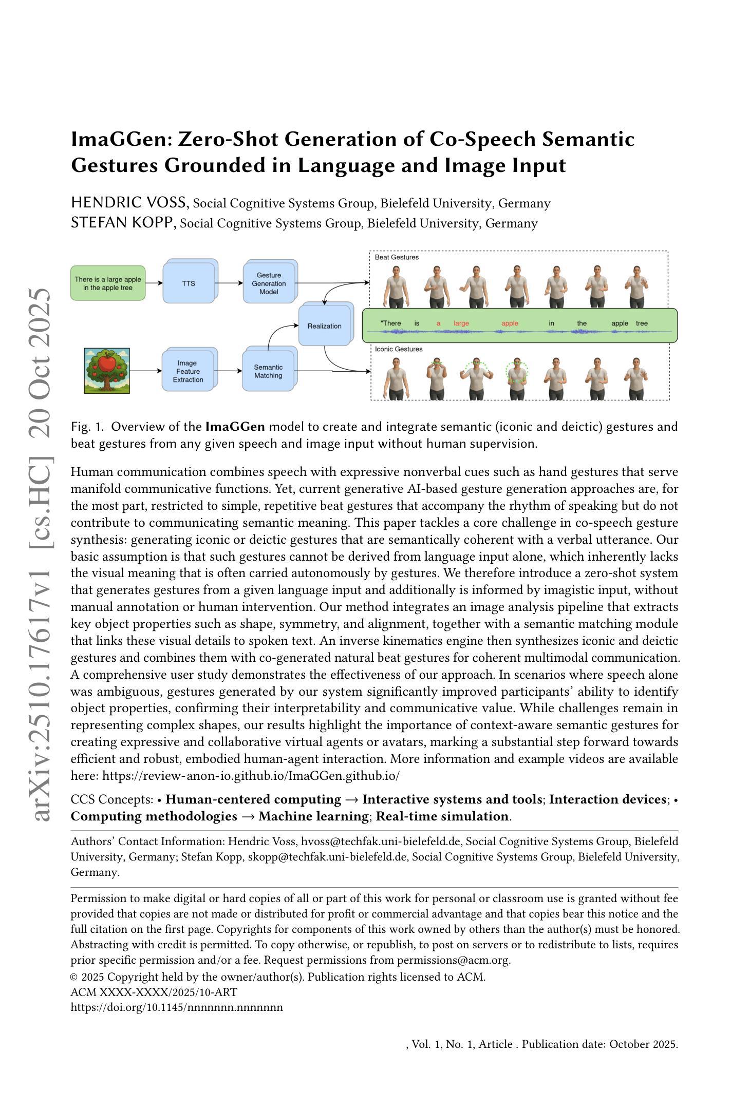 人类交流结合了言语和表达性的非言语线索,如手势等,这些线索起着多种交流功能。然而,当前的生成手势生成方法仅限于伴随说话节奏的简单重复节拍手势,但并不有助于传达语义意义。本文解决了协同语音手势合成中的核心挑战:生成与口头表达语义上连贯的象征性或指示性手势。这种手势不能仅仅从语言输入中得出,因为语言输入本身缺乏通常由手势自主携带的视觉意义。因此,我们引入了一个零样本系统,该系统可以根据语言输入生成手势,并额外由图像输入提供信息,无需手动注释或人工干预。我们的方法整合了一个图像分析管道,可以提取关键对象属性,如形状、对称性和对齐方式,以及一个语义匹配模块,该模块将这些视觉细节与口语文本联系起来。然后,逆向运动学引擎合成象征性和指示性手势,并与共同生成的自然节拍手势相结合,实现连贯的多模式交流。一项全面的用户研究证明了我们的方法的有效性。在仅使用语音的场景中,由我们的系统生成的手势显著提高了参与者识别对象属性的能力,证实了其可解释性和交流价值。虽然对表示复杂形状仍存在挑战,但我们的结果突显了上下文感知的语义手势对于创建表达性和协作性虚拟代理人或化身的重要性,朝着高效和稳健的实体人类代理交互迈出了实质性的步伐。更多信息和示例视频可在以下网址找到:https://review-anon-io.github.io/ImaGGen.github.io/。