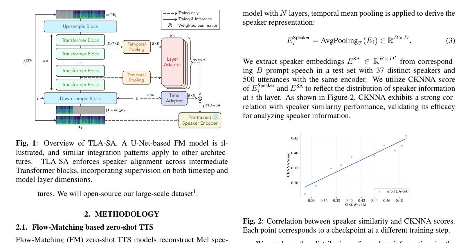 基于流匹配(FM)的零样本文本到语音(TTS)系统展现出高质量的语音合成和稳健的泛化能力。然而,此类系统的说话人表示能力仍然未被充分探索,这主要是因为FM框架中缺乏明确的说话人特定监督。为此,我们对说话人信息分布进行了实证分析,并揭示了其在时间步和网络层之间的非均匀分配,这强调了自适应说话人对齐的需要。因此,我们提出了时间层自适应说话人对齐(TLA-SA)方法,这是一种损失函数,它通过联合利用说话人信息中的时间和层次变化,提高说话人的一致性。实验结果表明,与基准系统相比,TLA-SA在研究和工业规模的数据集上显著提高说话人相似性,并且在不同的模型架构中都能有效泛化,包括仅解码器语言模型(LM)和基于FM的TTS系统等脱离LM的系统。