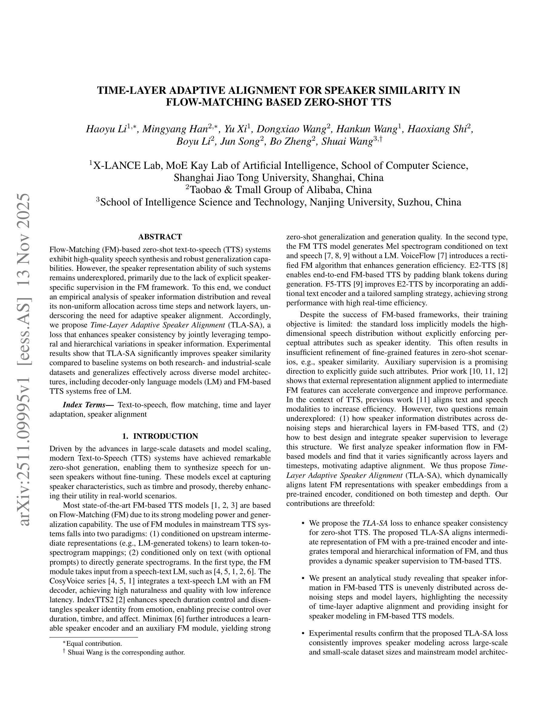 基于流匹配(FM)的零样本文本转语音(TTS)系统展现出高质量的语音合成和稳健的泛化能力。然而,该系统的说话人表征能力尚未得到充分探索,这主要是因为FM框架中缺乏明确的说话人特定监督。为此,我们进行了实证的说话人信息分布分析,揭示了其在时间步和网络层之间的非均匀分配,强调了自适应说话人对齐的必要性。因此,我们提出了时间层自适应说话人对齐(TLA-SA)损失函数,通过联合利用说话人信息的时态和层次变化,提高说话人一致性。实验结果表明,与基线系统相比,TLA-SA在研究和工业规模数据集上的说话人相似性显著提高,且在多种模型架构中表现有效,包括无语言模型(LM)的解码器仅语言模型和FM-based TTS系统。