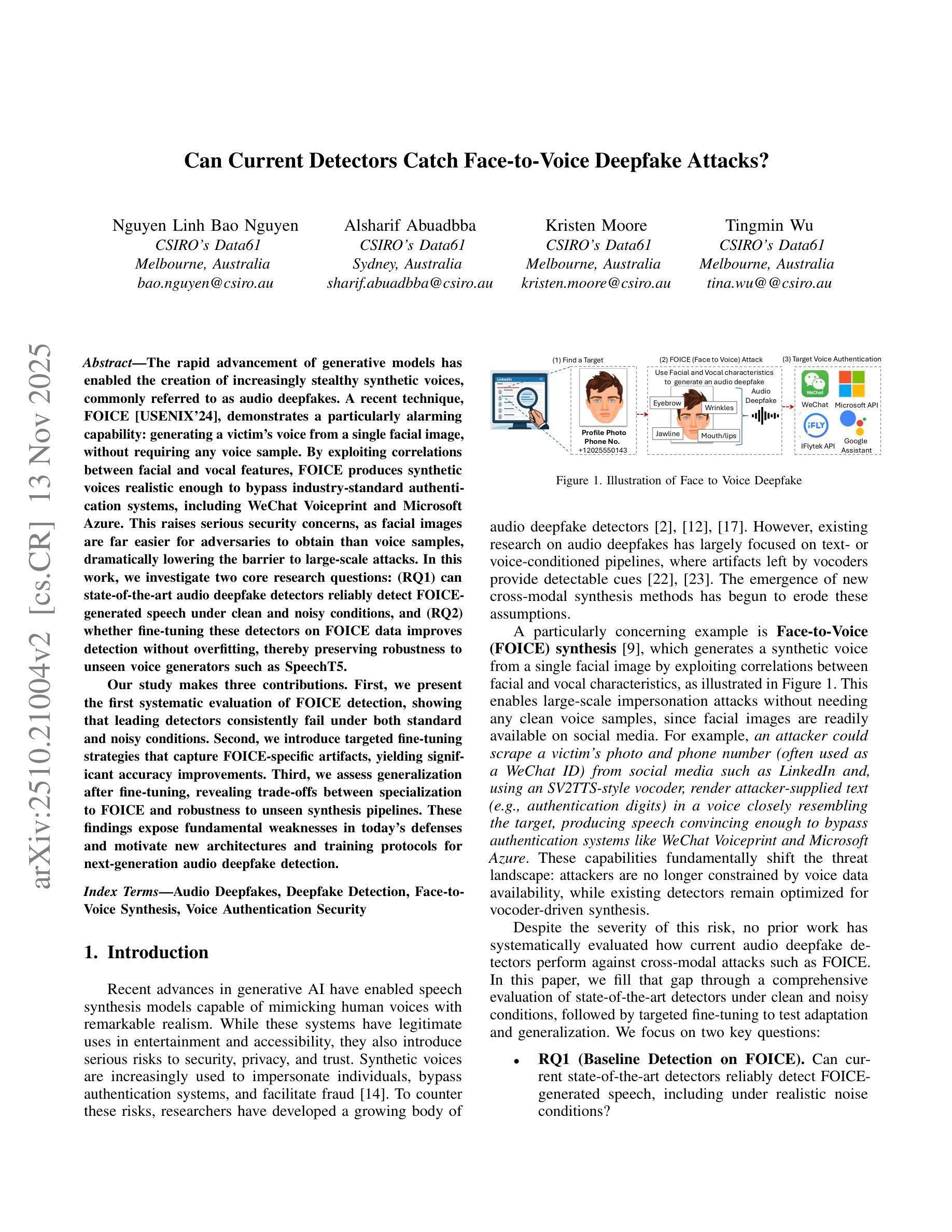 生成模型的快速发展使得越来越隐蔽的合成语音得以产生,通常被称为音频深度伪造。最近的一项技术FOICE[USENIX’24]展示了一种特别令人担忧的能力:仅通过一张面部图像生成受害者的声音,而无需任何语音样本。FOICE通过利用面部和语音特征之间的相关性,生成了足以绕过包括微信语音打印和微软Azure在内的行业标准认证系统的合成语音。这引发了严重的安全担忧,因为相对于语音样本,面部图像对于对手来说更容易获取,从而大大降低了大规模攻击的门槛。在这项工作中,我们研究了两个核心研究问题:(RQ1)最先进的音频深度伪造检测器是否能在干净和嘈杂的条件下可靠地检测FOICE生成的语音;(RQ2)在FOICE数据上对检测器进行微调是否能在不出现过度拟合的情况下提高检测能力,从而保持对未见语音生成器(如SpeechT5)的稳健性。我们的研究做出了三项贡献。首先,我们对FOICE检测进行了首次系统评估,表明领先的检测器在标准条件和嘈杂条件下都表现出持续的失败。其次,我们引入了有针对性的微调策略,以捕捉FOICE特定的伪迹,从而大大提高了准确性。第三,我们评估了微调后的泛化能力,揭示了针对FOICE的专业化与对未见合成管道稳健性之间的权衡。这些发现暴露了当前防御手段的根本弱点,并为下一代音频深度伪造检测提供了新架构和培训协议的动机。