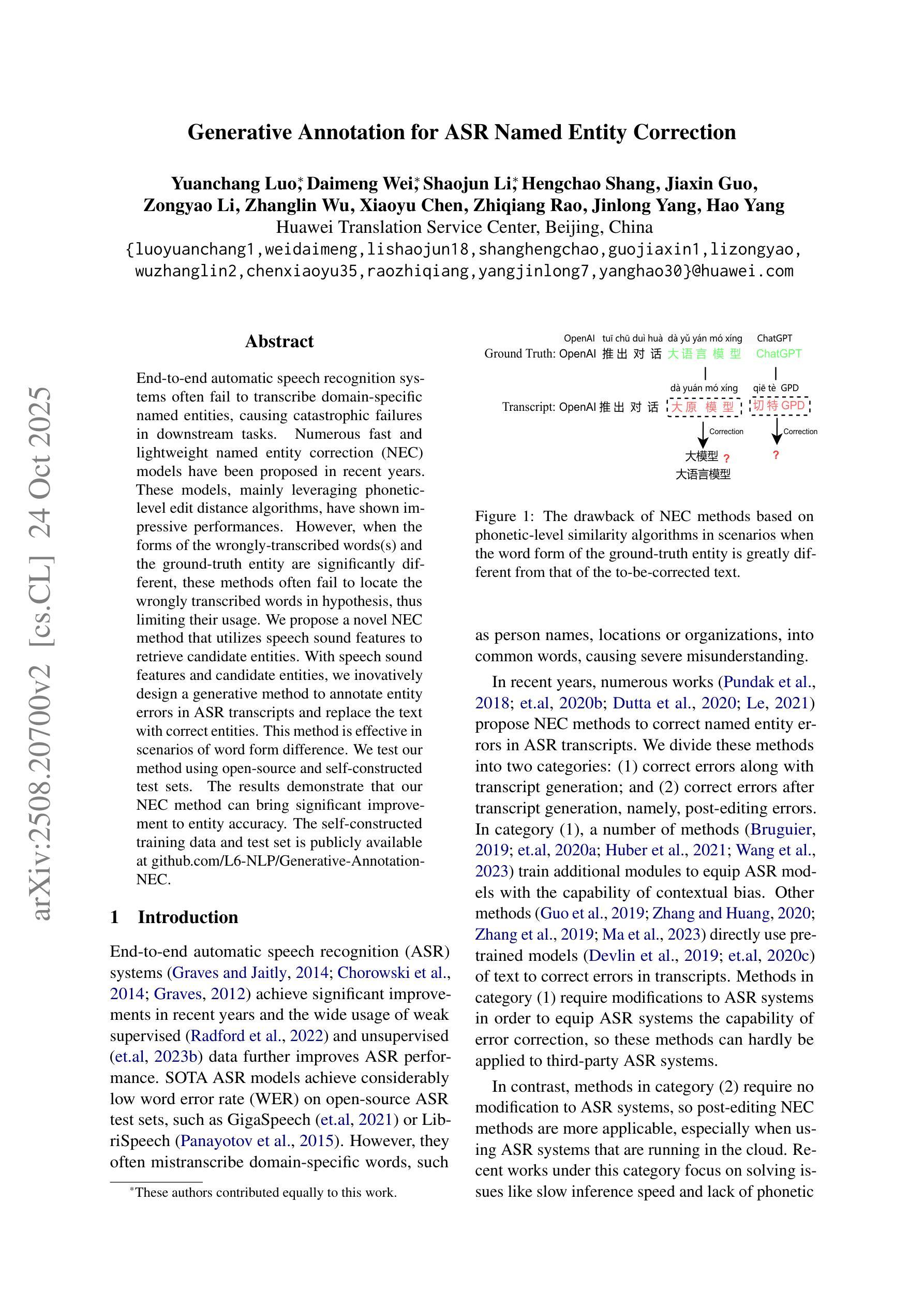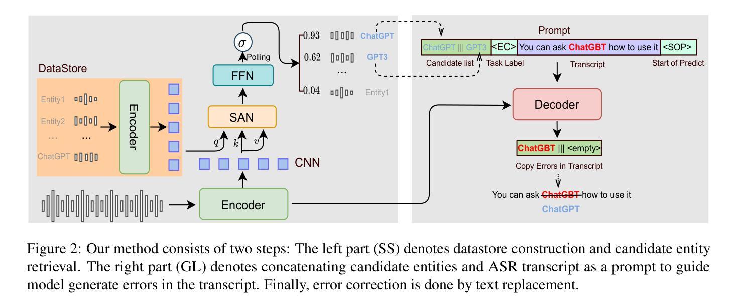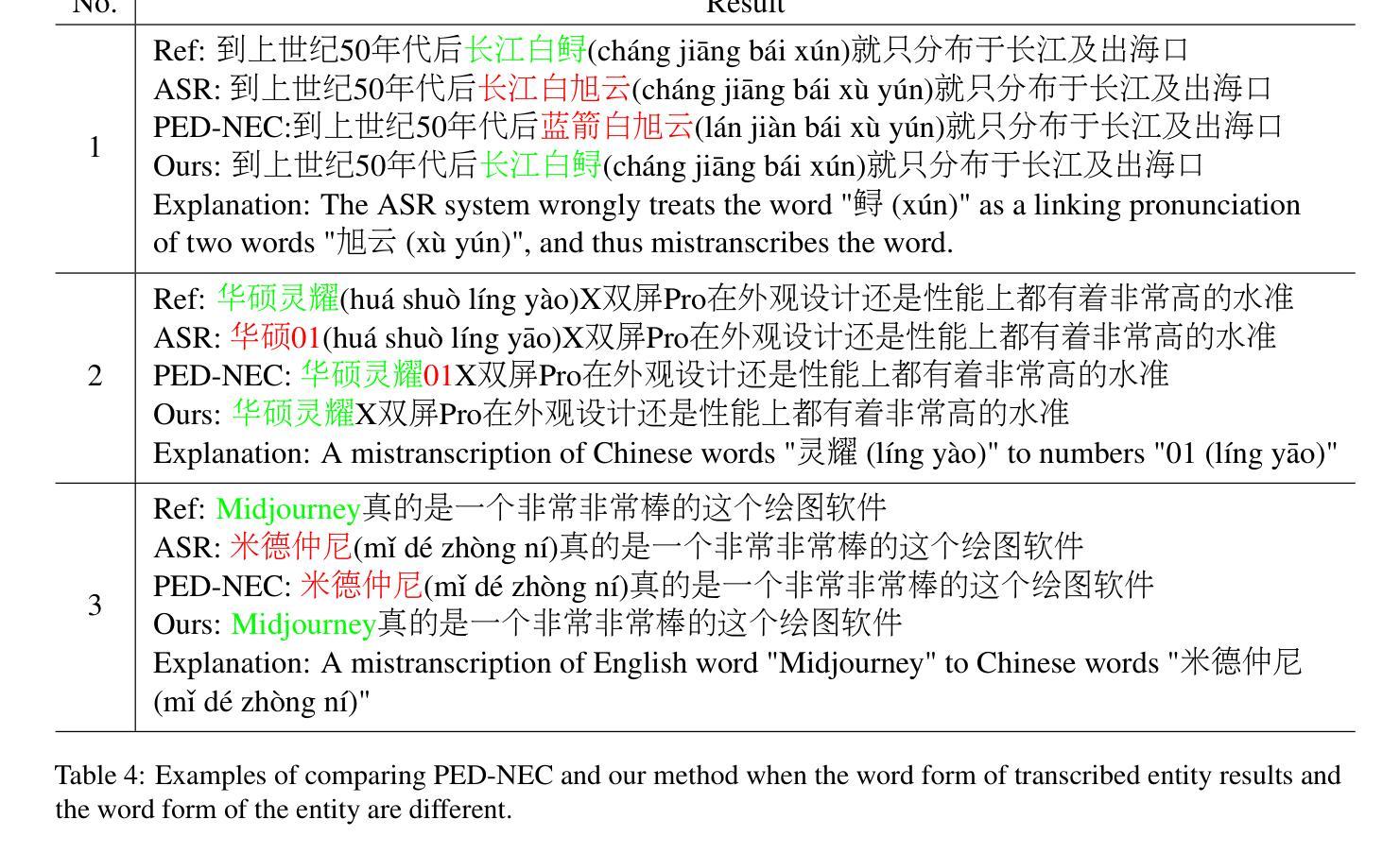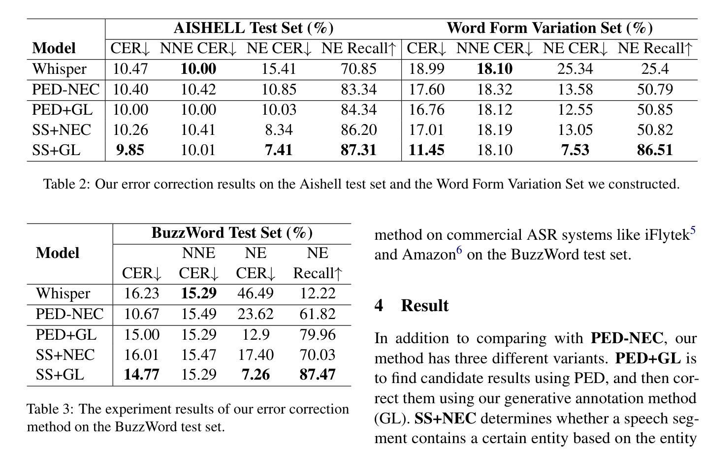 - 本文提出一种新型NEC方法,结合语音声音特征和候选实体进行实体错误标注和替换。