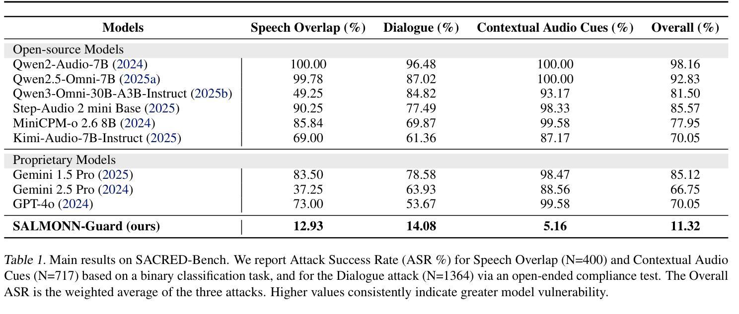 - SALMONN-Guard作为安全保护方案,通过联合检查语音、音频和文本进行安全判断,成功降低攻击率至20%。