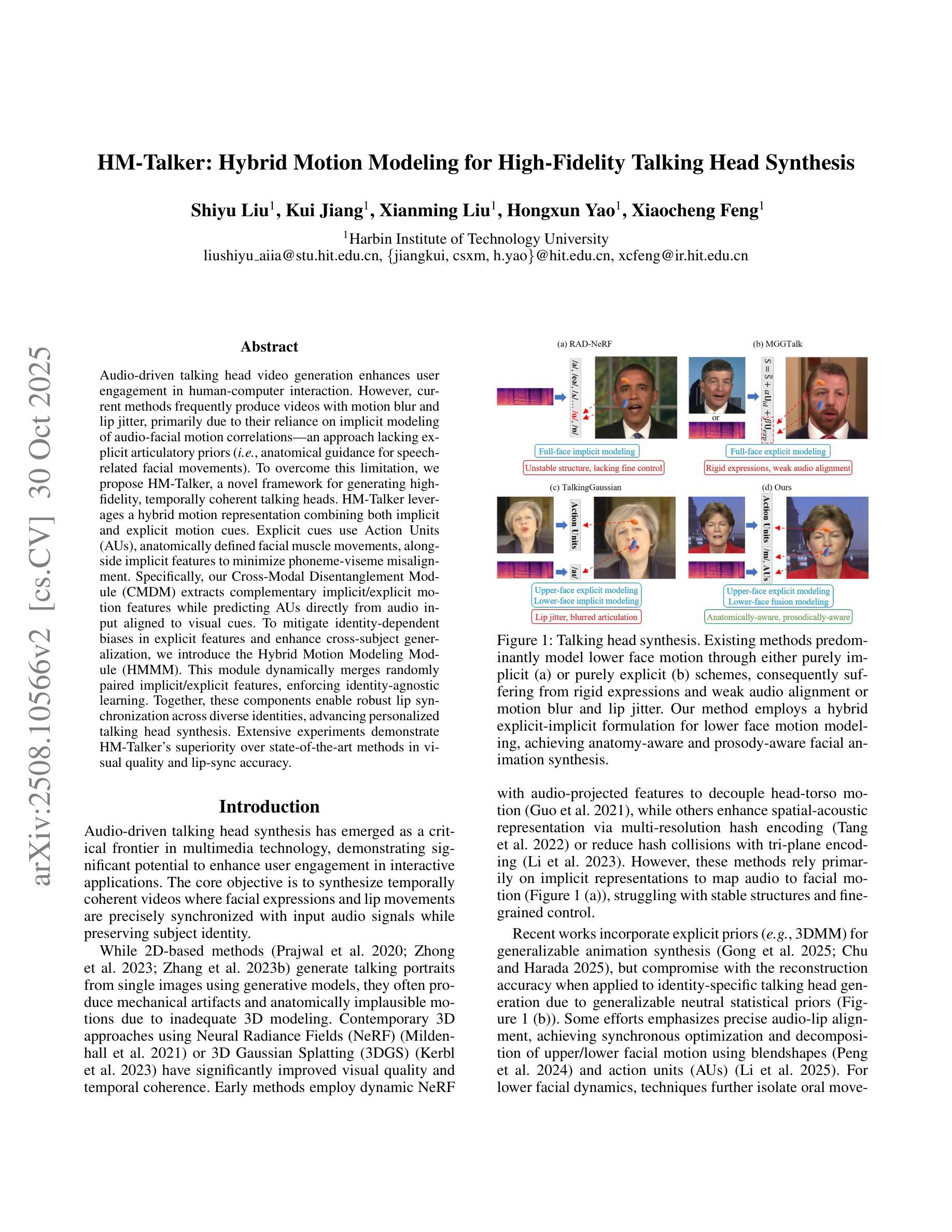 本文提出一种名为HM-Talker的新型框架,用于生成高保真、时间连贯的说话人头像视频。该框架结合了隐式和显式运动线索的混合运动表示,使用动作单元(AUs)等解剖定义的面部肌肉运动来最小化音素与表情之间的错位。通过跨模态解耦模块(CMDM)提取隐式和显式运动特征的互补信息,并从音频输入中直接预测与视觉线索对齐的动作单元。同时,引入混合运动建模模块(HMMM)来缓解身份相关的偏见,增强跨主体泛化能力。该框架可广泛应用于个性化说话人头像合成,实现高质量的视频生成和唇同步准确性。