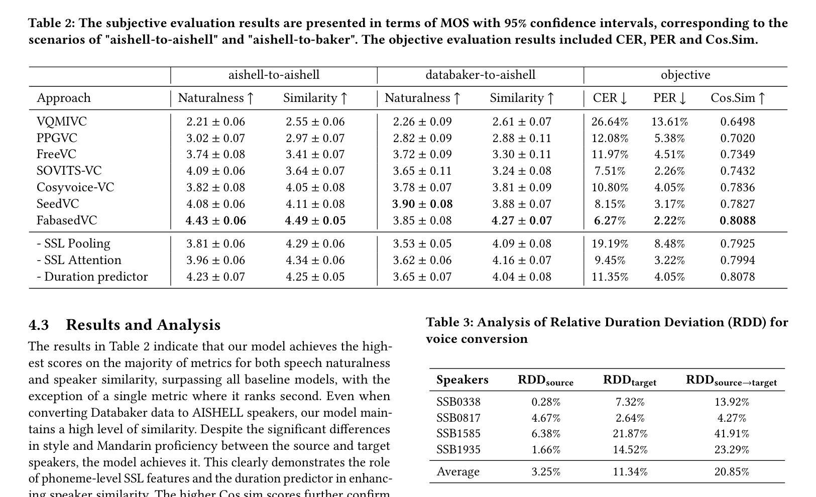 - 实验结果表明,FabasedVC在自然度、相似性和内容完整性方面较其他系统有优异表现。