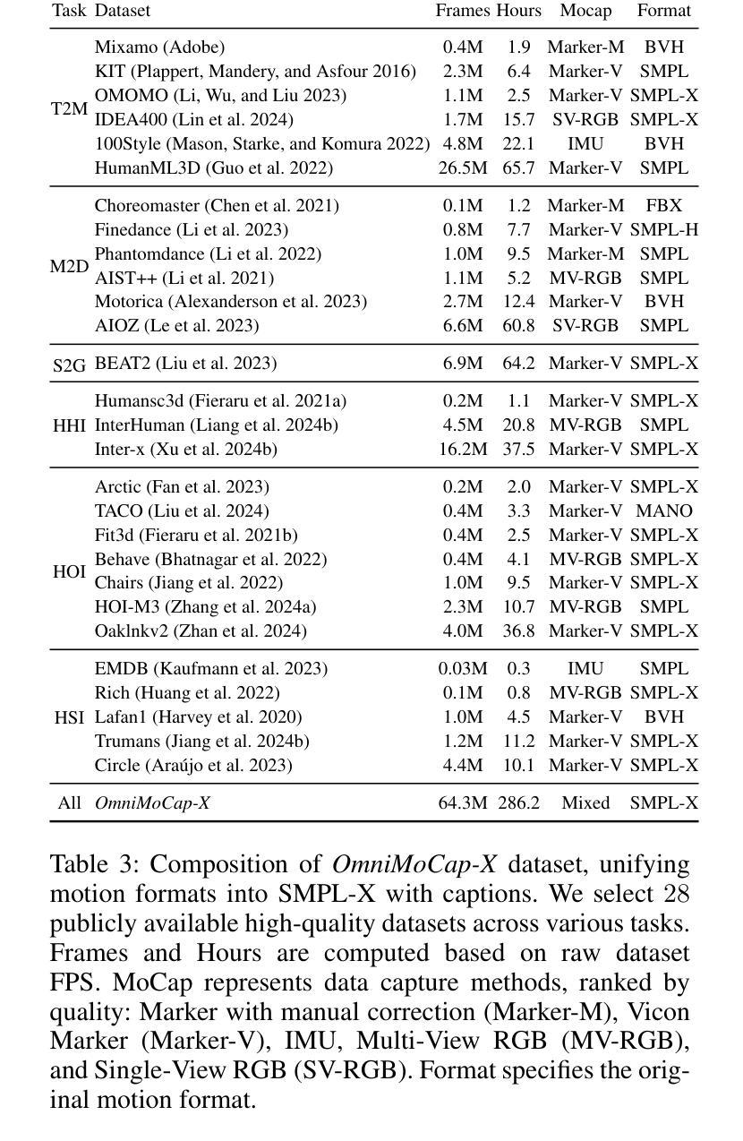 - 构建OmniMoCap-X数据集用于高质量多模态训练,集成了多个MoCap源。