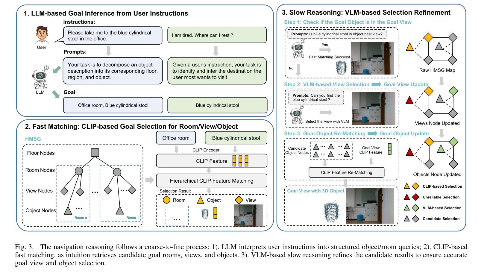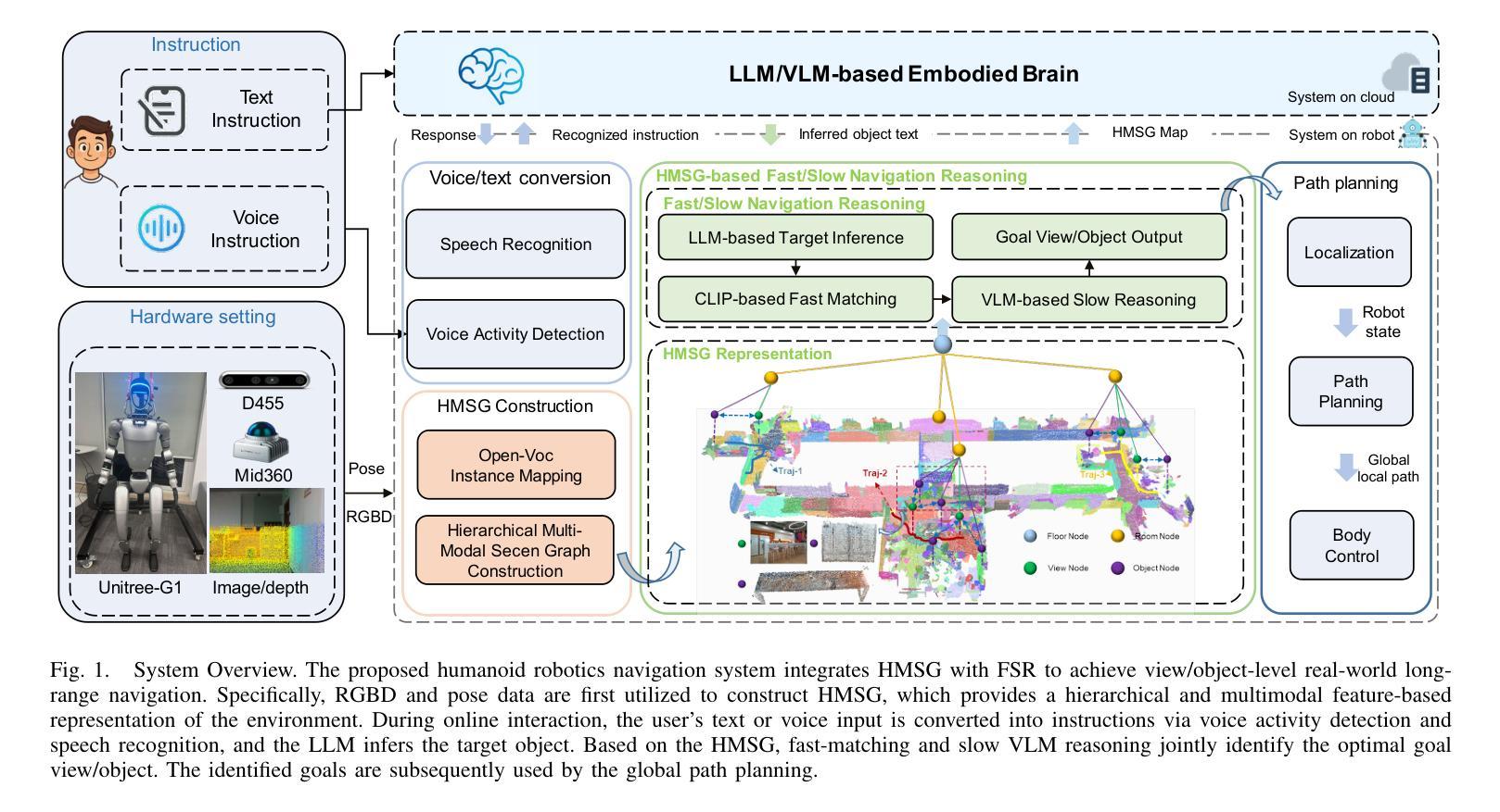 视觉语言导航(VLN)是机器人系统中的一个基本挑战,具有在现实世界的环境中部署实体代理的广泛应用。尽管最近有进展,但现有方法在远程空间推理方面仍存在局限,通常表现出成功率低和推理延迟高的问题,特别是在远程导航任务中。为了克服这些局限性,我们提出了FSR-VLN,一种结合分层多模式场景图(HMSG)和快慢导航推理(FSR)的视觉语言导航系统。HMSG提供了一种多模式地图表示,支持从粗糙的房间级定位到精细的目标视图和对象识别的渐进检索。基于HMSG,FSR首先进行快速匹配,以有效地选择候选房间、视图和对象,然后应用VLM驱动的细化进行最终目标选择。我们在由人形机器人收集的四个综合室内数据集上评估了FSR-VLN,利用87条指令涵盖了各种对象类别。FSR-VLN在所有数据集上的检索成功率(RSR)均达到最新水平,同时在激活仅在快速直觉失败时才启动的慢速推理时,与基于VLM的方法相比,将响应时间减少了82%。此外,我们将FSR-VLN与Unitree-G1人形机器人的语音交互、规划和控制模块集成,实现自然语言交互和实时导航。