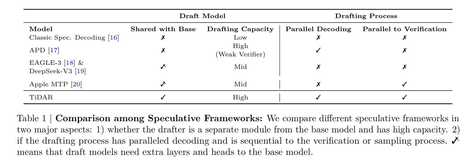 - TiDAR利用GPU计算资源,在草稿和验证容量之间取得平衡。