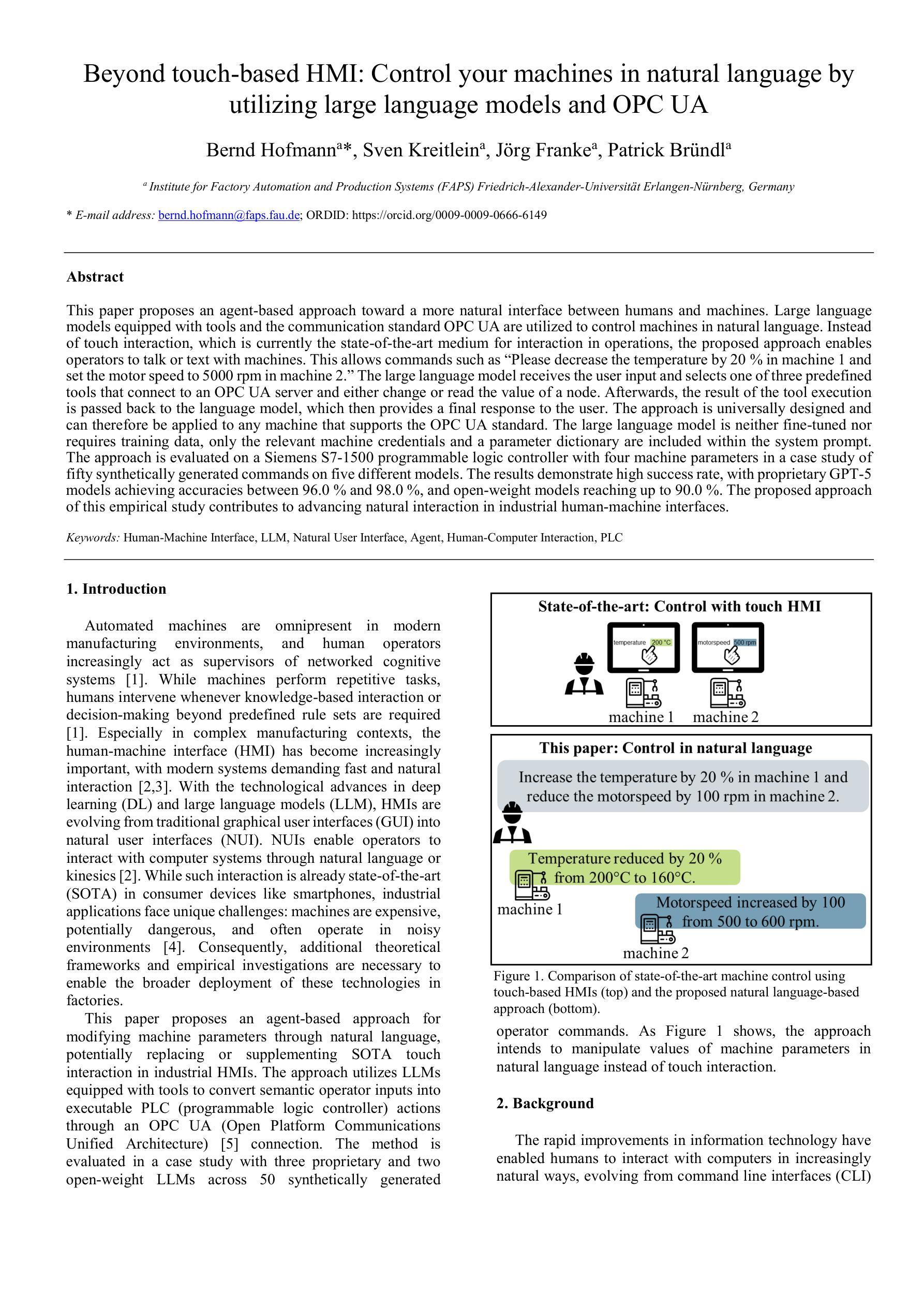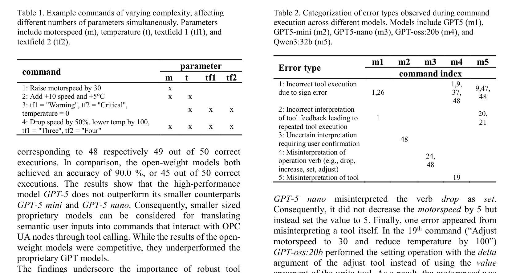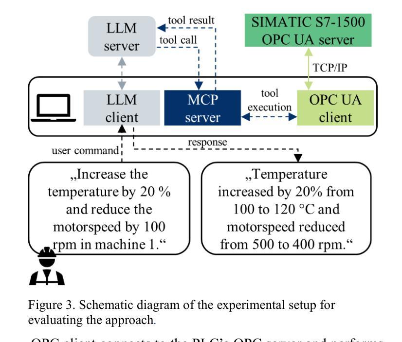本文提出了一种基于代理的方法,以实现更自然的人机交互界面。利用配备工具和通信标准OPC UA的大型语言模型,以自然语言控制机器,而无需使用当前的触摸交互作为操作交互的主流媒介。所提出的方法使操作者可以与机器进行对话或文本交流,例如下达指令:“请在机器1中将温度降低20%并将机器2的电机速度设置为5000转/分。”大型语言模型接收用户输入,并选择三种预定义工具之一连接到OPC UA服务器,以更改或读取节点的值。然后,工具执行的结果将反馈给语言模型,然后为用户提供最终响应。该方法设计通用,可应用于支持OPC UA标准的任何机器。大型语言模型既不需要微调也不需要训练数据,系统中只需包含相关的机器凭据和参数词典即可。该方法在西门子S7-1500可编程逻辑控制器上进行评估,在一个案例研究中使用五十个合成生成的命令对五个不同模型进行测试。结果显示成功率很高,专有GPT 5模型的准确率在96.0%至98.0%之间,开放权重模型的准确率高达90.0%。本实证研究所提出的方法有助于推动工业人机界面中的自然交互发展。