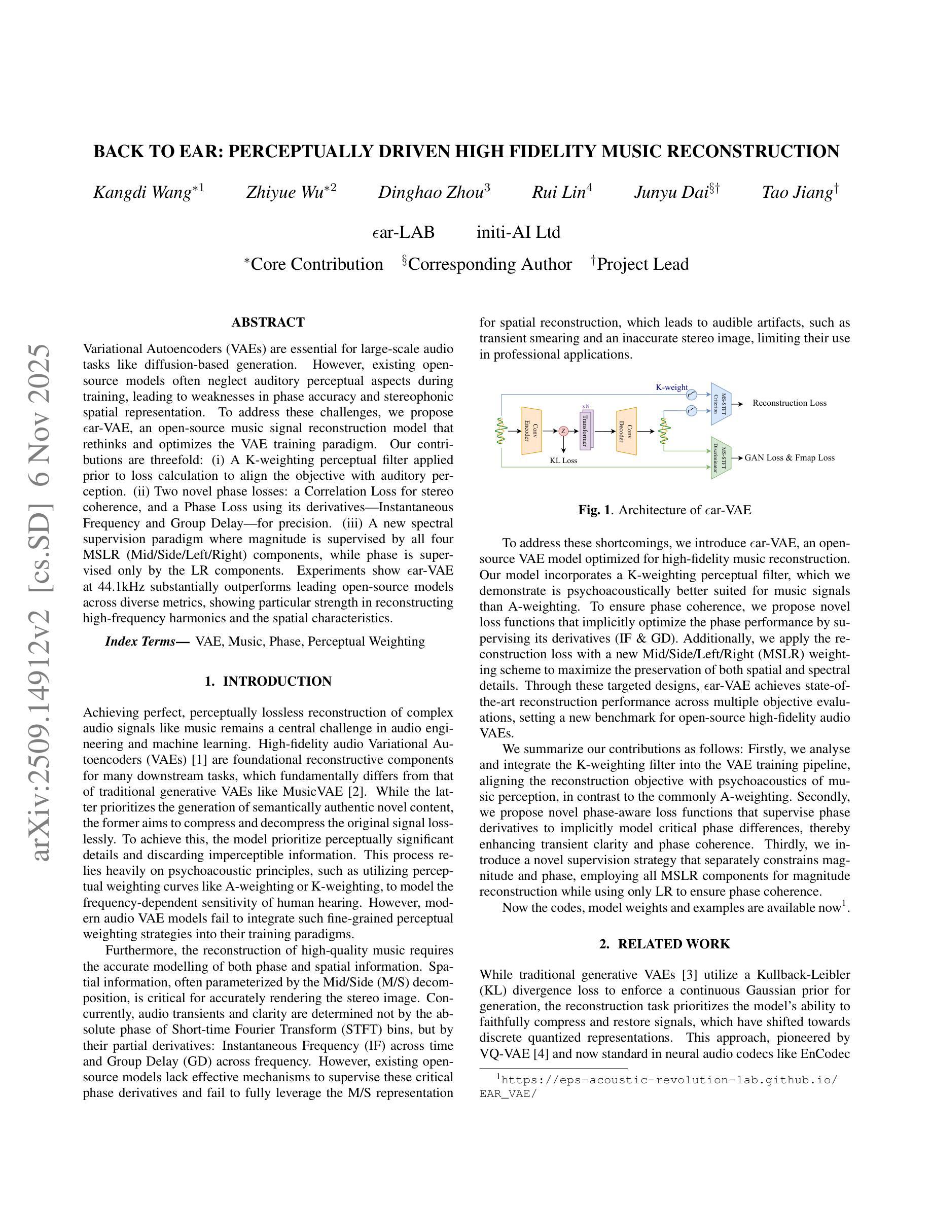 变分自编码器(VAEs)对于基于扩散生成的大型音频任务至关重要。然而,现有的开源模型在训练过程中往往忽视了听觉感知方面,导致相位准确性和立体声空间表征的弱点。为了应对这些挑战,我们提出了εar-VAE,这是一个开源的音乐信号重建模型,它重新思考和优化了VAE训练范式。我们的贡献主要体现在三个方面:(i)在损失计算之前应用K-加权感知滤波器,以使目标与听觉感知相符。(ii)两种新型相位损失:用于立体声连贯性的相关性损失,以及使用其导数(即时频率和群延迟)的相位损失,以提高精度。(iii)一种新的频谱监督范式,其中幅度由四个中/侧/左/右组件进行监督,而相位仅由LR组件进行监督。实验表明,在44.1kHz下,εar-VAE在多种指标上的表现均优于领先的开源模型,特别是在重建高频谐波和空间特性方面表现出特别的优势。