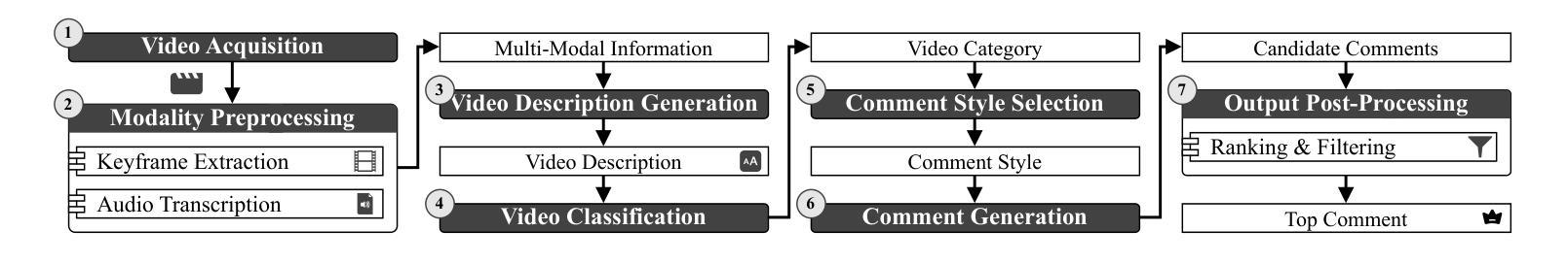 - 系统支持六种评论风格,结合视频分割、上下文和情感分析以及风格感知提示构建技术。