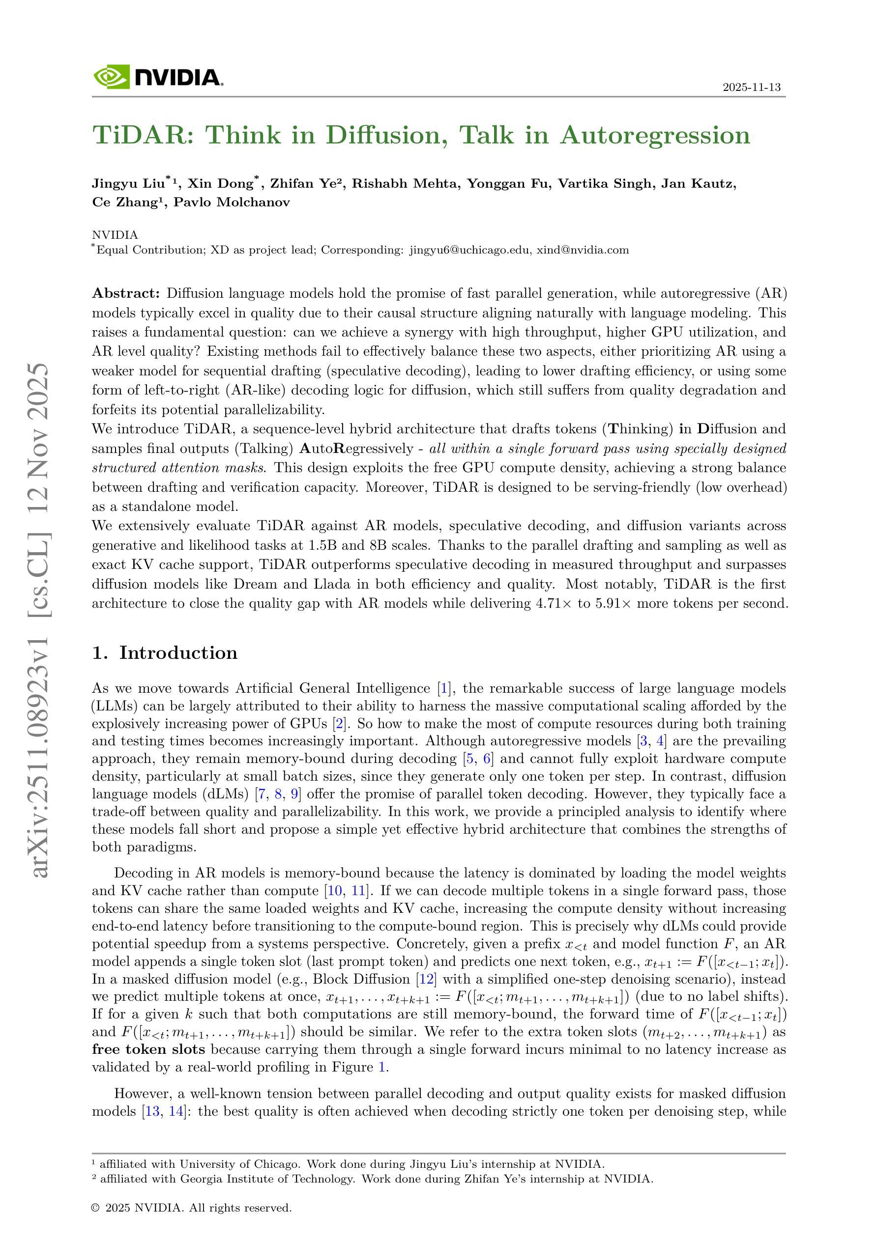 扩散语言模型具有快速并行生成的潜力,而自回归(AR)模型通常因其自然符合语言建模的因果结构而在质量上表现出色。这引发了一个根本性的问题:我们能否实现高吞吐量、更高的GPU利用率和AR级质量的协同?现有方法无法有效地平衡这两方面,要么使用较弱的模型进行顺序起草(推测解码),优先考虑AR,导致起草效率降低,要么采用某种形式的自左至右(AR类似)解码逻辑进行扩散,这仍然会导致质量下降并丧失了其潜在的并行性。我们引入了TiDAR,这是一个序列级混合架构,在扩散中进行符号(思考)起草,并以自回归方式(说话)采样最终输出——所有这些都使用专门设计的结构化注意力掩码在一次前向传递中完成。这种设计利用了免费的GPU计算密度,在起草和验证容量之间实现了强大的平衡。此外,TiDAR被设计为作为独立模型友好服务(低开销)。我们对TiDAR进行了广泛的评估,与AR模型、推测解码以及扩散变体在生成和可能性任务上的1.5B和8B规模进行了比较。由于并行起草和采样以及精确的KV缓存支持,TiDAR在衡量吞吐量上优于推测解码,并且在效率和质量上超过了如Dream和Llada等扩散模型。尤其值得一提的是,TiDAR是首个在质量上缩小与AR模型差距的架构,同时每秒处理令牌的数量提高了4.71倍至5.91倍。