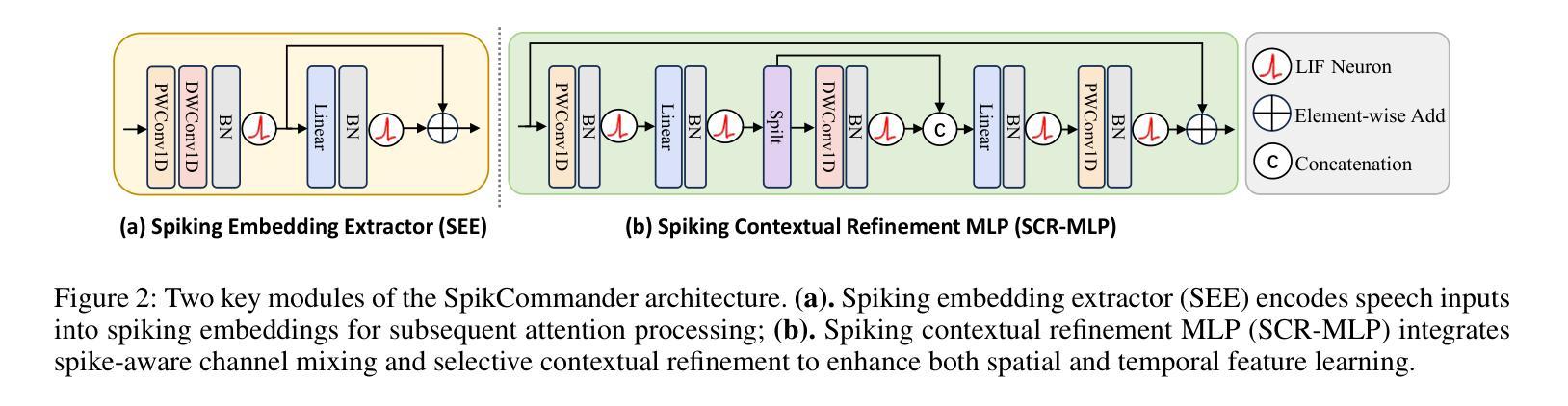 脉冲神经网络(Spiking Neural Networks,简称SNNs)通过利用其事件驱动的处理模式,为实现能源高效的语音指令识别(Speech Command Recognition,简称SCR)提供了有前景的路径。然而,现有的基于SNN的SCR方法在捕捉语音中的丰富时间依赖性和上下文信息方面常常遇到困难,这主要是由于有限的时间建模和基于二进制的脉冲表示。为了应对这些挑战,我们首先引入了多视角脉冲时间感知自注意力(Multi-view Spiking Temporal-aware Self-Attention,简称MSTASA)模块,该模块结合了有效的脉冲时间感知注意力与多视角学习框架,以模拟语音指令中的互补时间依赖性。基于MSTASA,我们进一步提出了SpikCommander,这是一种完全由脉冲驱动的变压器架构,它将MSTASA与脉冲上下文细化通道MLP(SCR-MLP)相结合,以共同增强时间上下文建模和通道级特征集成。我们在三个基准数据集上评估了我们的方法:脉冲海德堡数据集(Spiking Heidelberg Dataset,简称SHD)、脉冲语音指令(Spiking Speech Commands,简称SSC)和谷歌语音指令V2(Google Speech Commands V2,简称GSC)。大量实验表明,SpikCommander在参数较少的情况下始终优于最新的SNN方法,并且在相似的时间步长下表现出其有效性和高效性,为稳健的语音指令识别提供了强有力的支持。