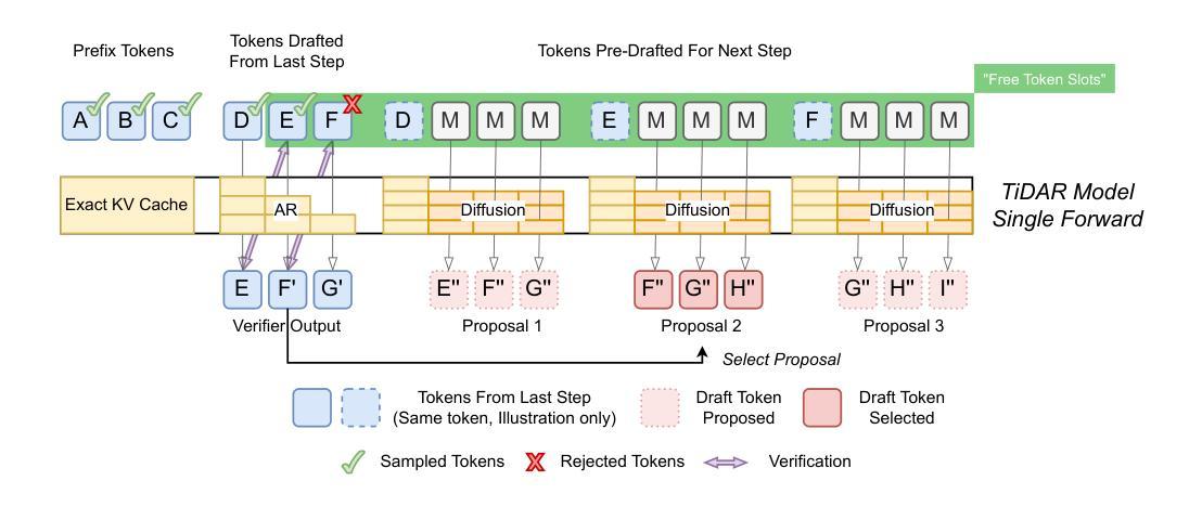 - TiDAR通过一次前向传递实现令牌草稿和最终输出的自回归采样。