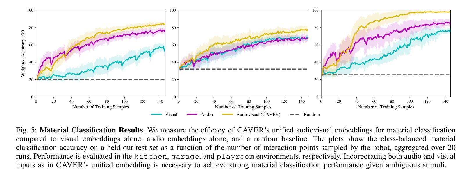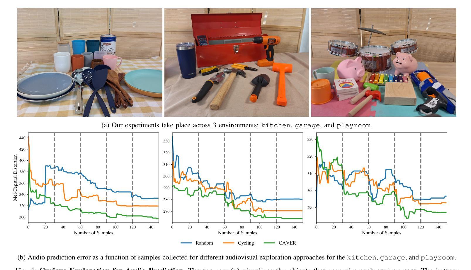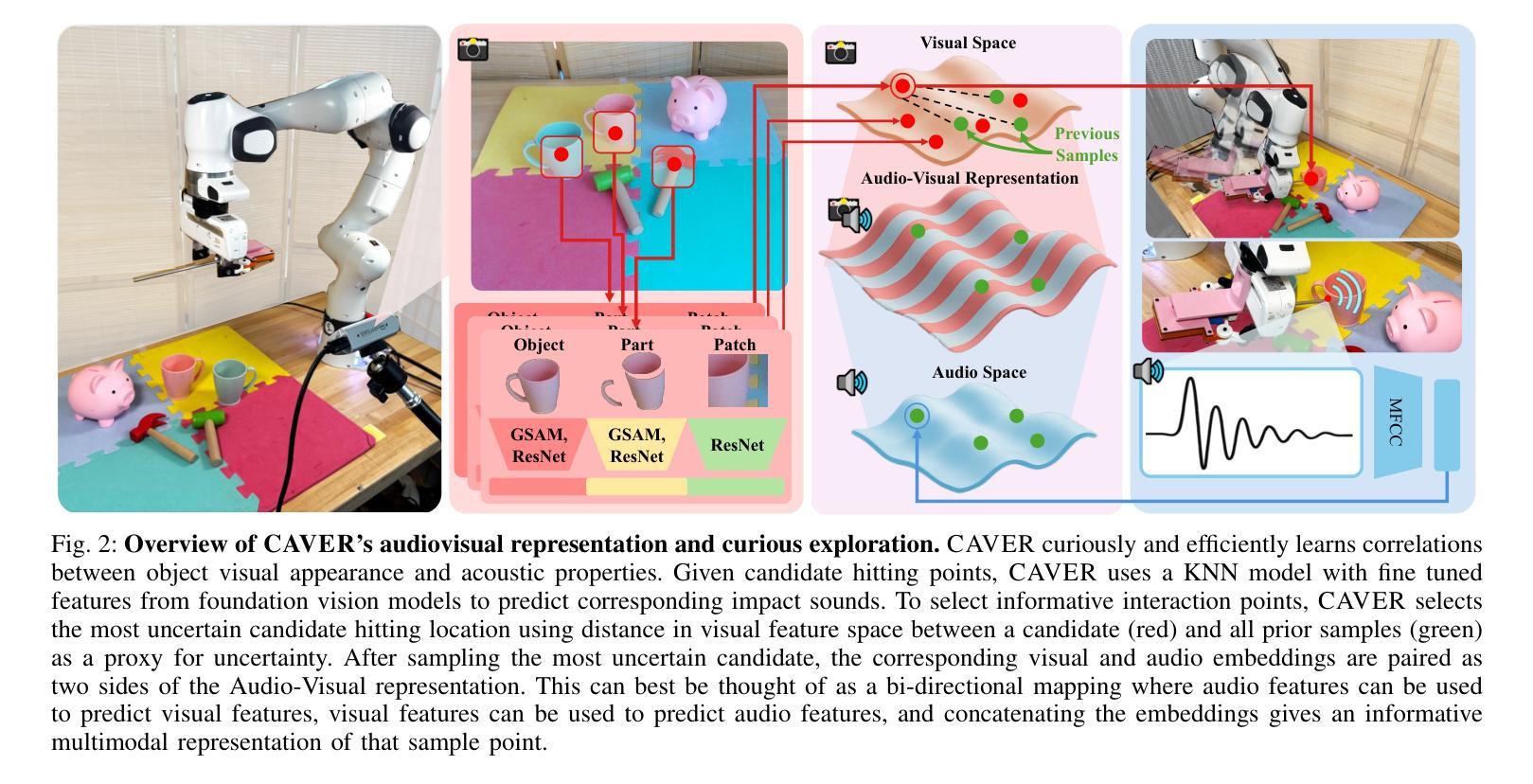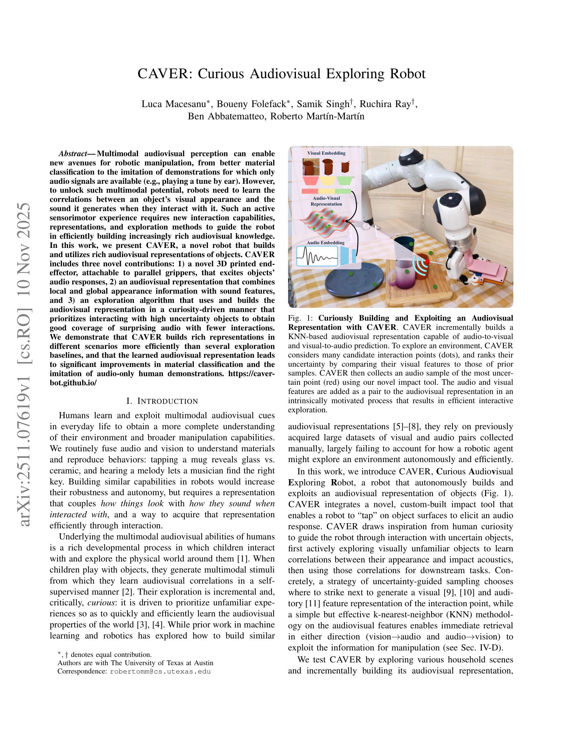 本文主要介绍了一种名为CAVER的新型机器人技术,它能够构建和利用丰富的视听对象表示。通过三项新贡献,包括可附着于平行夹具的3D打印末端执行器、结合局部和全局外观信息与声音特征的视听表示,以及好奇心驱动的探索算法,CAVER机器人能够在不同场景下更有效地构建丰富的视听知识表示,显著提高材料分类和仅听音频的人类演示模仿的准确性。