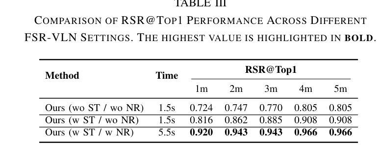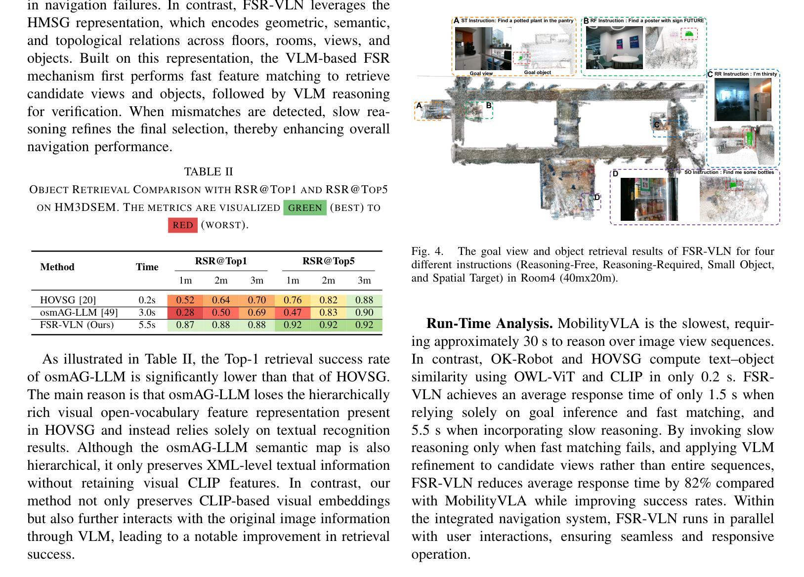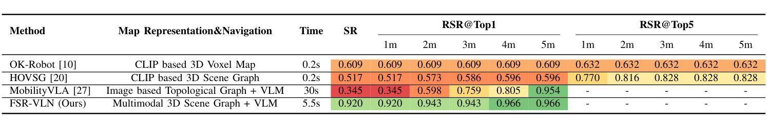 - 在四个室内数据集上评估,FSR-VLN达到最新性能水平,显著提高检索成功率(RSR),并大大减少响应时间。
