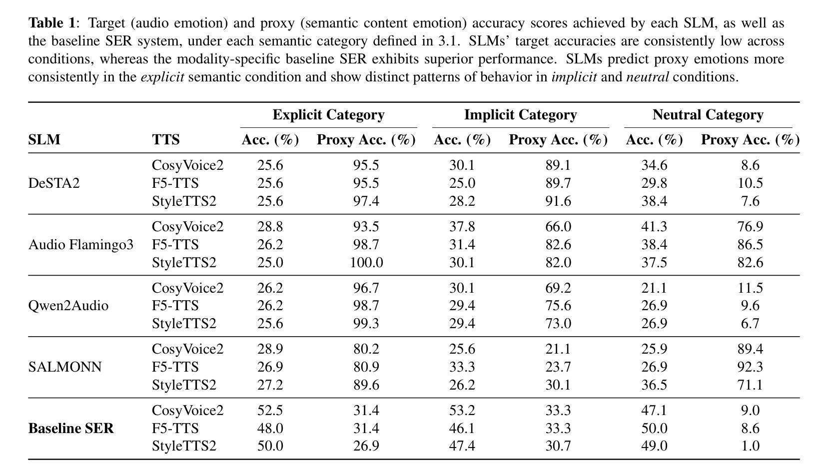 - SLMs主要依赖于文本语义完成语音情感识别任务,而非语音情感。