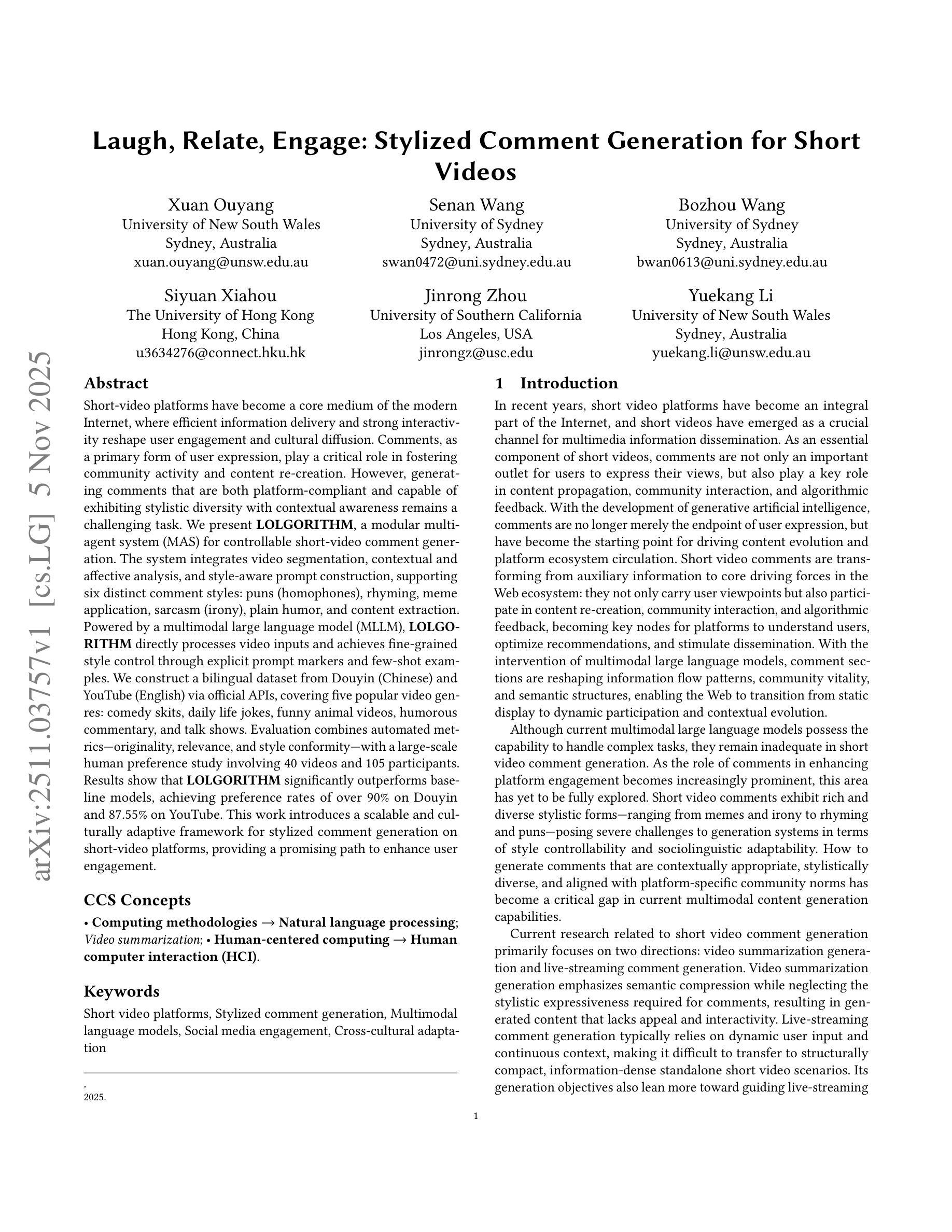 短视频平台已成为现代互联网景观中的核心媒介,高效的信息传递和强大的交互性正在重塑用户参与和文化传播。评论在促进社区参与和内容再创作方面发挥着至关重要的作用。然而,生成既符合平台规范又具备风格多样性和上下文意识的评论仍然是一个重大挑战。我们推出了LOLGORITHM,这是一个为可控短视频评论生成设计的模块化多智能体系统(MAS)。该系统融合了视频分割、上下文和情感分析以及风格感知提示构建。它支持六种不同的评论风格:双关语、押韵、模因应用、讽刺、普通幽默和内容提取。借助多模态大型语言模型(MLLM),LOLGORITHM直接处理视频输入,并通过明确的提示标记和少量示例实现精细风格控制。为了支持和评估,我们使用抖音(中文)和YouTube(英文)的官方API构建了一个双语数据集,涵盖了五种流行的视频类型:喜剧短片、日常生活笑话、有趣的动物剪辑、幽默评论和脱口秀。评估结合了自动化指标原创性、相关性和风格一致性以及大规模的人类偏好研究,涉及40个视频和11名参与者。结果表明,LOLGORITHM显著优于基线模型,在抖音上的偏好率达到9%以上,YouTube上的偏好率达到87.5%。这项工作为短视频平台上的风格化评论生成提供了一个可扩展和文化适应的框架,为增强用户参与度和创造性互动提供了有希望的途径。