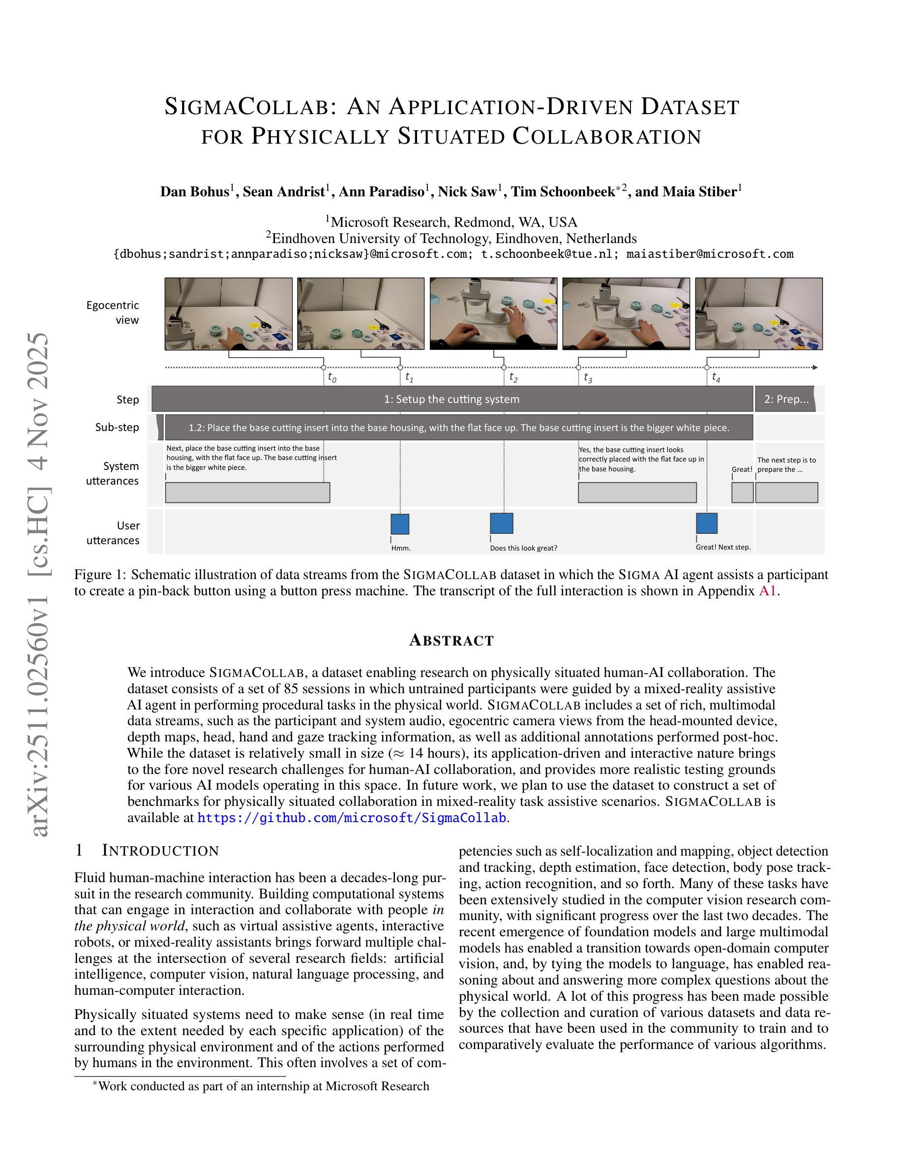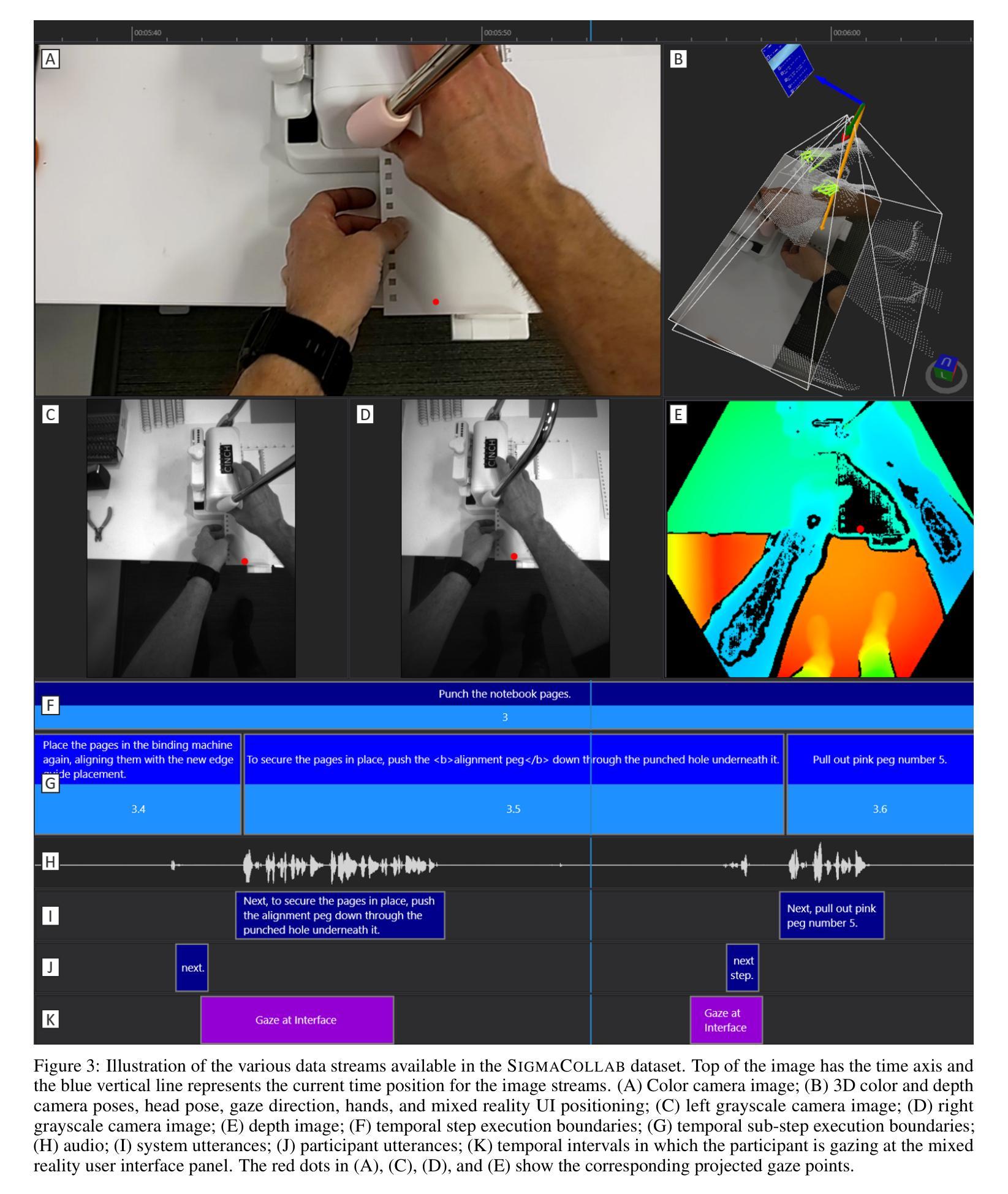 我们介绍了SigmaCollab数据集,该数据集支持对物理环境中人类与人工智能合作的研究。数据集包含85个会话集,其中未经过训练的参与者在一个混合现实辅助人工智能代理的指导下,在物理世界中执行程序任务。SigmaCollab包含一组丰富的多模式数据流,如参与者和系统音频、头戴设备上的以自我为中心的相机视图、深度图、头部、手部以及注视追踪信息,以及事后进行的额外注释。虽然数据集大小相对较小(约14小时),但其应用驱动和交互性为针对人类与人工智能合作的研究带来了新的挑战,并为各种在此空间运行的AI模型提供了更现实的测试平台。未来,我们计划使用该数据集为混合现实任务辅助场景中的物理环境合作构建一套基准测试。SigmaCollab可在https://github.com/microsoft/SigmaCollab获取。