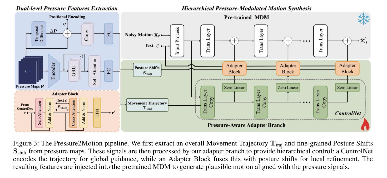 - Pressure2Motion结合了压力序列的物理线索和描述性文本的语义指导,以精准指导运动生成。