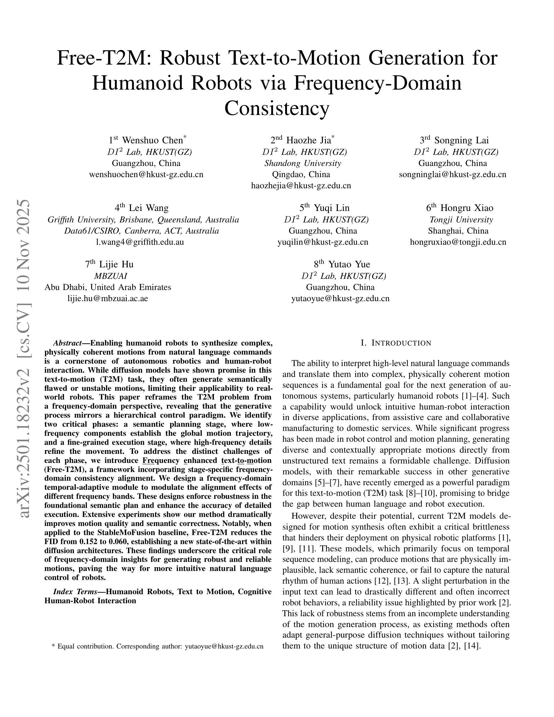 本文探讨了使类人机器人能够从自然语言命令中合成复杂、物理连贯的运动的重要性。针对扩散模型在文本到运动(T2M)任务中生成语义缺陷或不稳定运动的问题,本文提出从频率域角度重新考虑T2M问题,并引入频率增强文本到运动(Free-T2M)框架,通过阶段特定的频率域一致性对齐来解决两个关键阶段——语义规划阶段和精细执行阶段的挑战。实验表明,该方法显著提高运动质量和语义准确性,当应用于StableMoFusion基线时,FID从0.152降低到0.060,建立了一个新的扩散架构内的最佳水平。这些发现强调了频率域洞察对于生成稳健和可靠运动的关键作用,为更直观的机器人自然语言控制铺平了道路。