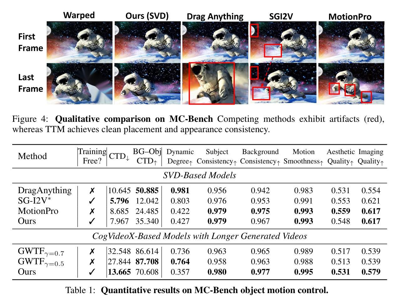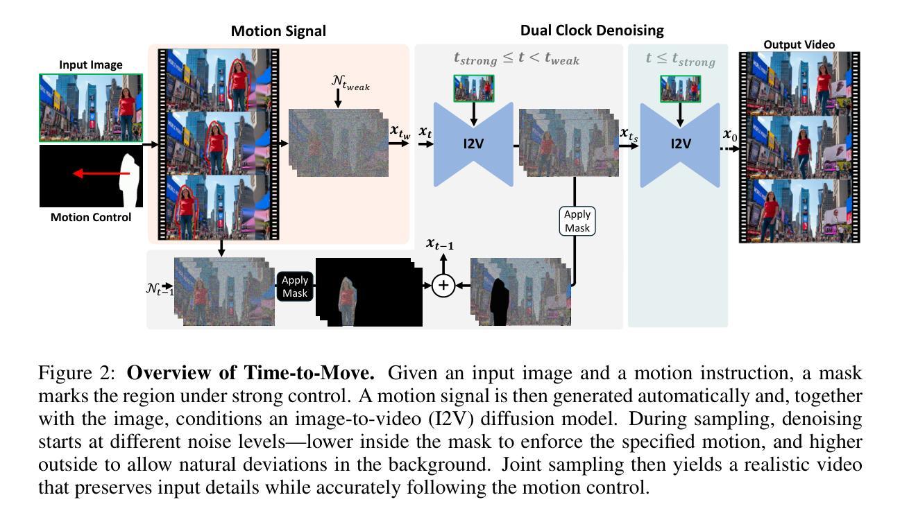 基于扩散的视频生成技术能够生成逼真的视频,但现有的图像和文字条件无法提供精确的运动控制。过去的方法需要针对模型进行特定的微调,这既计算量大又有限制。我们推出Time-to-Move(TTM),这是一种无需训练、即插即用的框架,用于运动控制和外观控制的视频生成,结合图像到视频的扩散模型。我们的关键见解是使用用户友好的操作(如剪切和拖动或深度重新投影)获得的粗略参考动画。受SDEdit使用粗略布局线索进行图像编辑的启发,我们将粗略动画视为粗略运动线索并适应视频领域。我们保留图像条件以保持外观,并引入双时钟去噪,这是一种区域依赖策略,强制运动指定区域中的强对齐,同时允许其他区域的灵活性,平衡了符合用户意图的自然动态。这种采样过程的轻量级修改没有产生额外的训练或运行成本,并且与任何主干架构都兼容。在物体和相机运动基准测试上的广泛实验表明,TTM在真实感和运动控制方面匹配或超过现有的基于训练的对标物。此外,TTM还引入了独特的精确外观控制能力,通过像素级的条件超越文本提示的局限性。更多视频示例和代码请访问我们的项目页面:[https://time-to-move.github.io/]”。