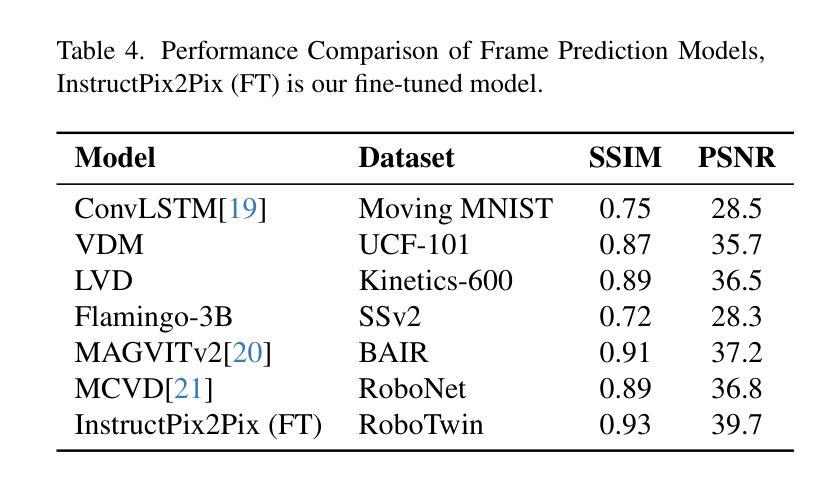 - 方法在RoboTWin数据集上实现了较高的SSIM和PSNR指标。