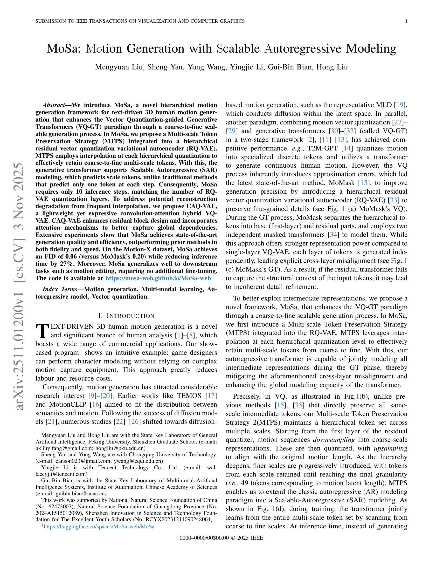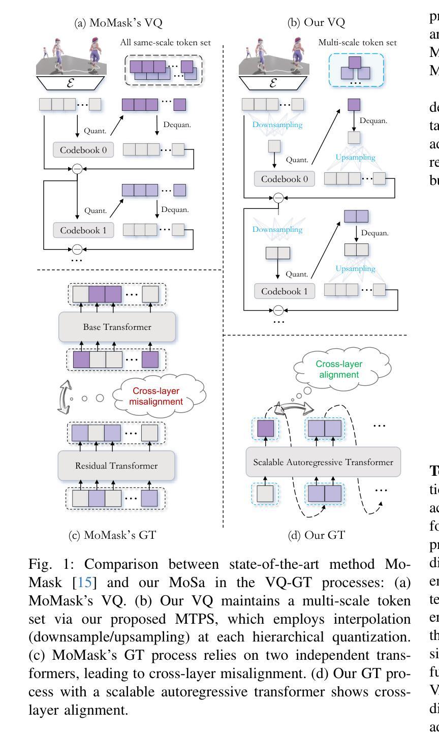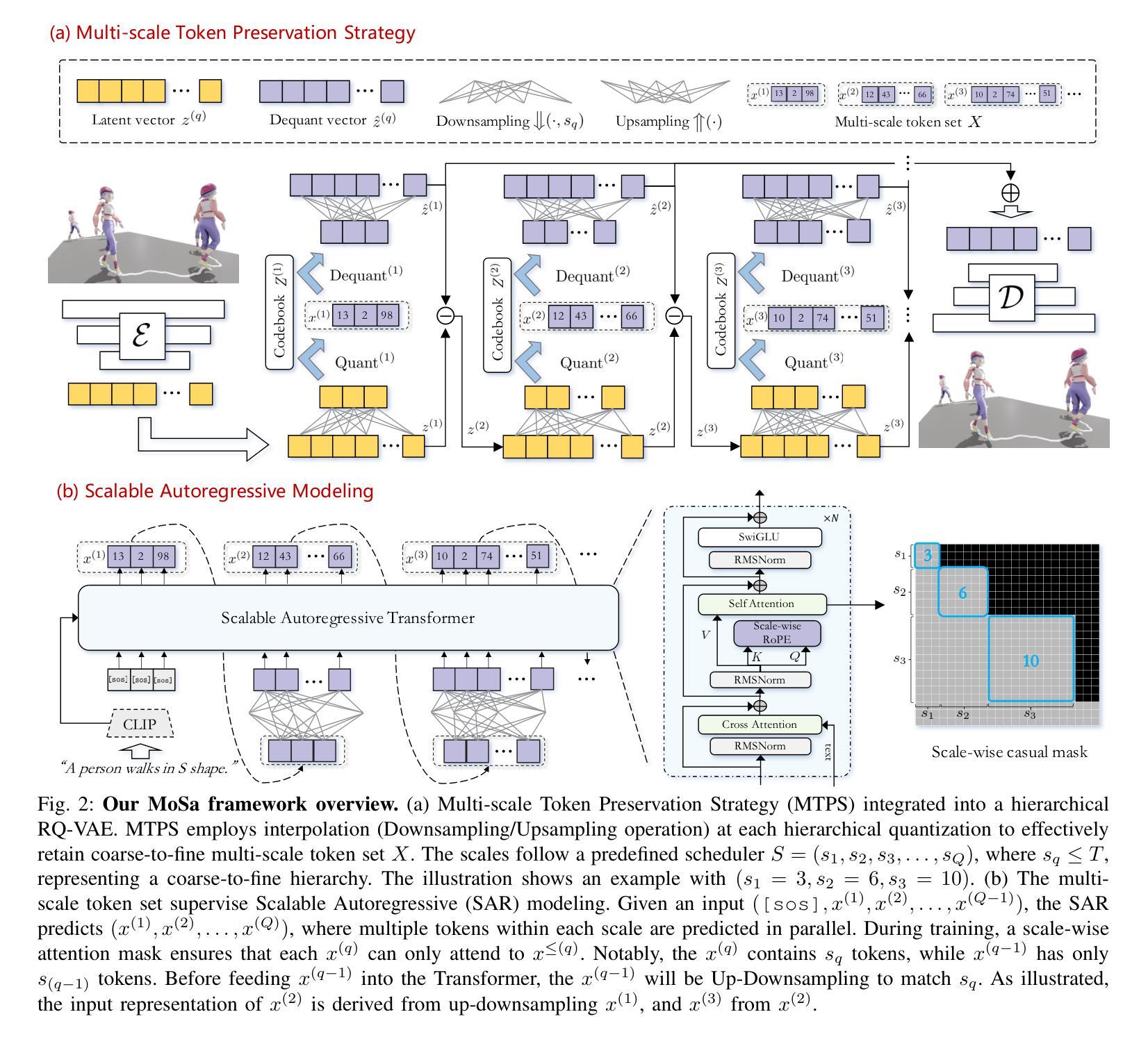 本文介绍了MoSa,一种用于文本驱动的三维人体运动生成的新型分层运动生成框架。MoSa改进了基于向量量化的生成性转换器(VQ-GT)范式,通过粗细结合的分层生成过程,实现了优秀的运动生成效果。MoSa采用多尺度令牌保留策略(MTPS),集成到分层残差向量量化变分自编码器(RQ-VAE)中。MTPS通过在每个分层量化中进行插值,有效地保留了粗到细的多元令牌。因此,生成性转换器支持可伸缩的自回归(SAR)建模,可预测不同尺度的令牌,不同于传统方法在每个步骤中只预测一个令牌。MoSa仅需要10个推理步骤,与RQ-VAE的量化层数相匹配。为解决频繁插值可能导致的重建质量下降问题,我们提出了CAQ-VAE,一种轻便而表现力强的卷积注意力混合VQ-VAE。CAQ-VAE优化了残差块设计,并融入了注意力机制,以更好地捕捉全局依赖性。实验表明,MoSa在生成质量和效率方面达到了最新水平,在Motion-X数据集上的FID得分为0.06(对比MoMask的0.20),同时减少了27%的推理时间。此外,MoSa在下游任务如运动编辑中具有良好的泛化能力,无需额外微调。