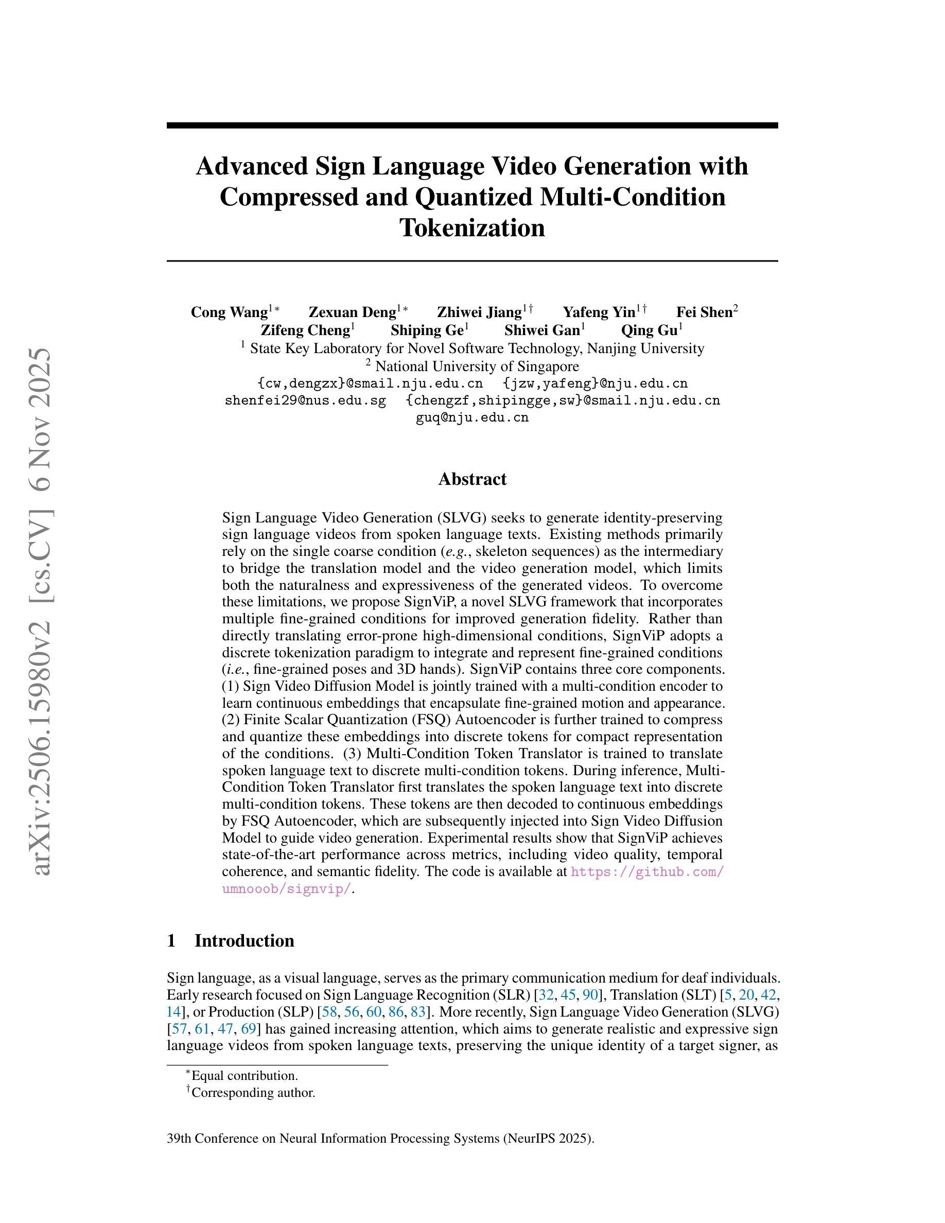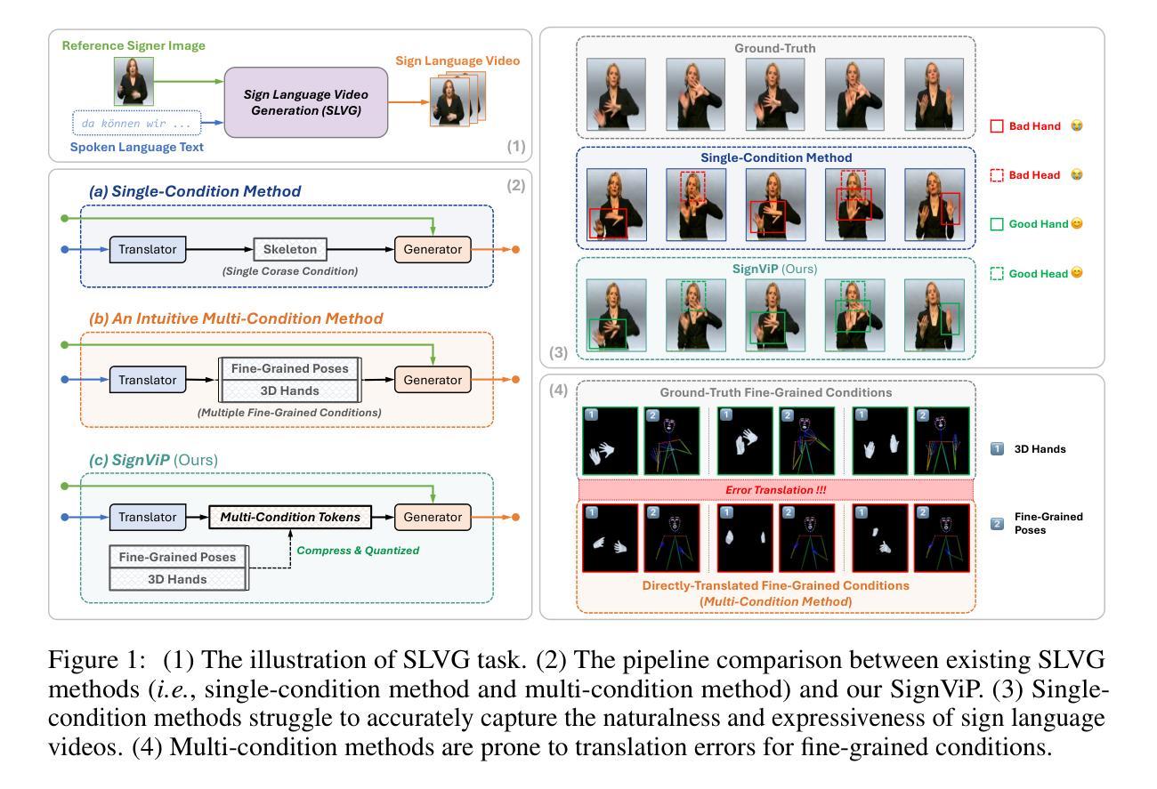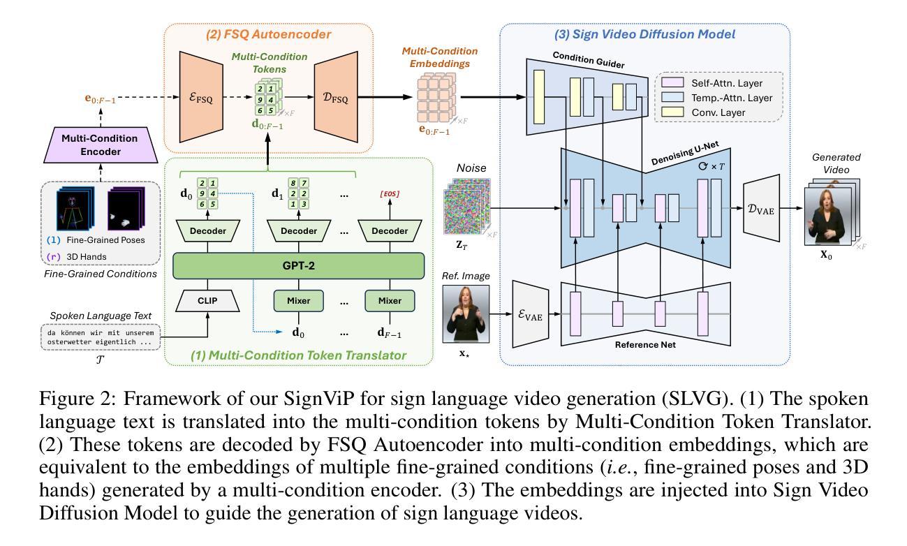 手势语言视频生成(SLVG)旨在从口语文本生成保持身份的手势语言视频。现有方法主要依赖于单一粗略条件(例如骨架序列)作为翻译模型和视频生成模型之间的桥梁,这限制了生成视频的自然度和表现力。为了克服这些限制,我们提出了SignViP,这是一个新的SLVG框架,它结合了多种精细条件,以提高生成的保真度。SignViP没有直接翻译容易出错的高维条件,而是采用离散标记化范式来集成和表示精细条件(即精细姿势和3D手)。SignViP包含三个核心组件。(1)手势视频扩散模型与多条件编码器共同训练,学习连续的嵌入,这些嵌入包含精细运动和外观。 (2)有限标量量化(FSQ)自动编码器进一步训练这些嵌入,将其压缩并量化为离散标记,以紧凑表示条件。(3)多条件标记翻译器被训练用于将口语文本翻译成离散的多条件标记。在推理过程中,多条件标记翻译器首先将口语文本翻译成离散的多条件标记。这些标记随后被FSQ自动编码器解码为连续的嵌入,然后注入手势视频扩散模型以指导视频生成。实验结果表明,SignViP在视频质量、时间连贯性和语义保真度等各项指标上均达到最新技术水平。代码可用https://github.com/umnooob/signvip/访问。
