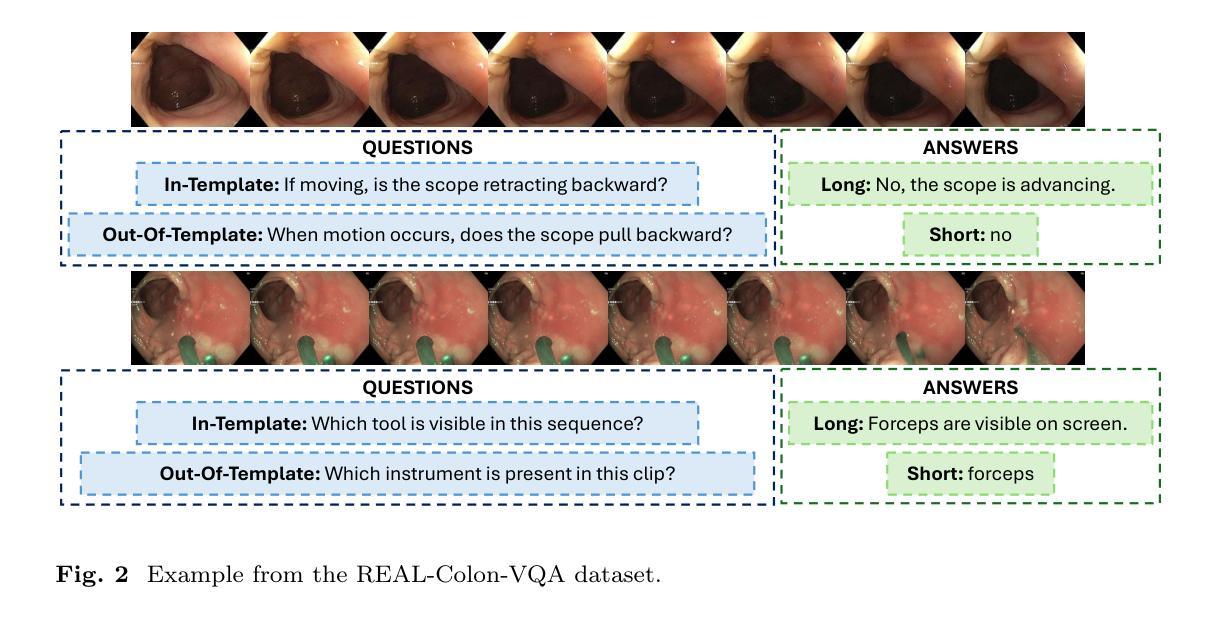 - REAL-Colon-VQA数据集的建立,包括运动相关问题、诊断属性和出模板的问题,用于评估模型性能。