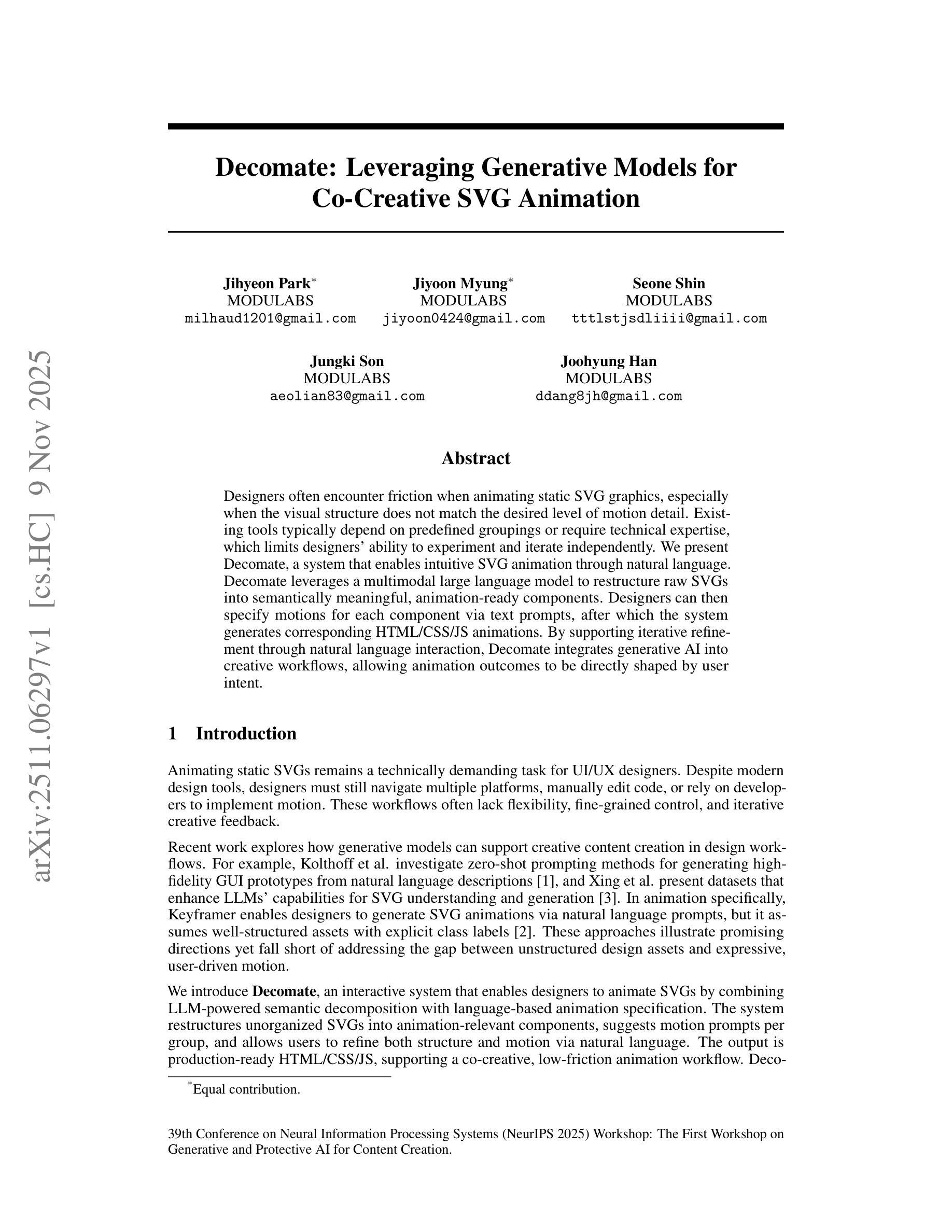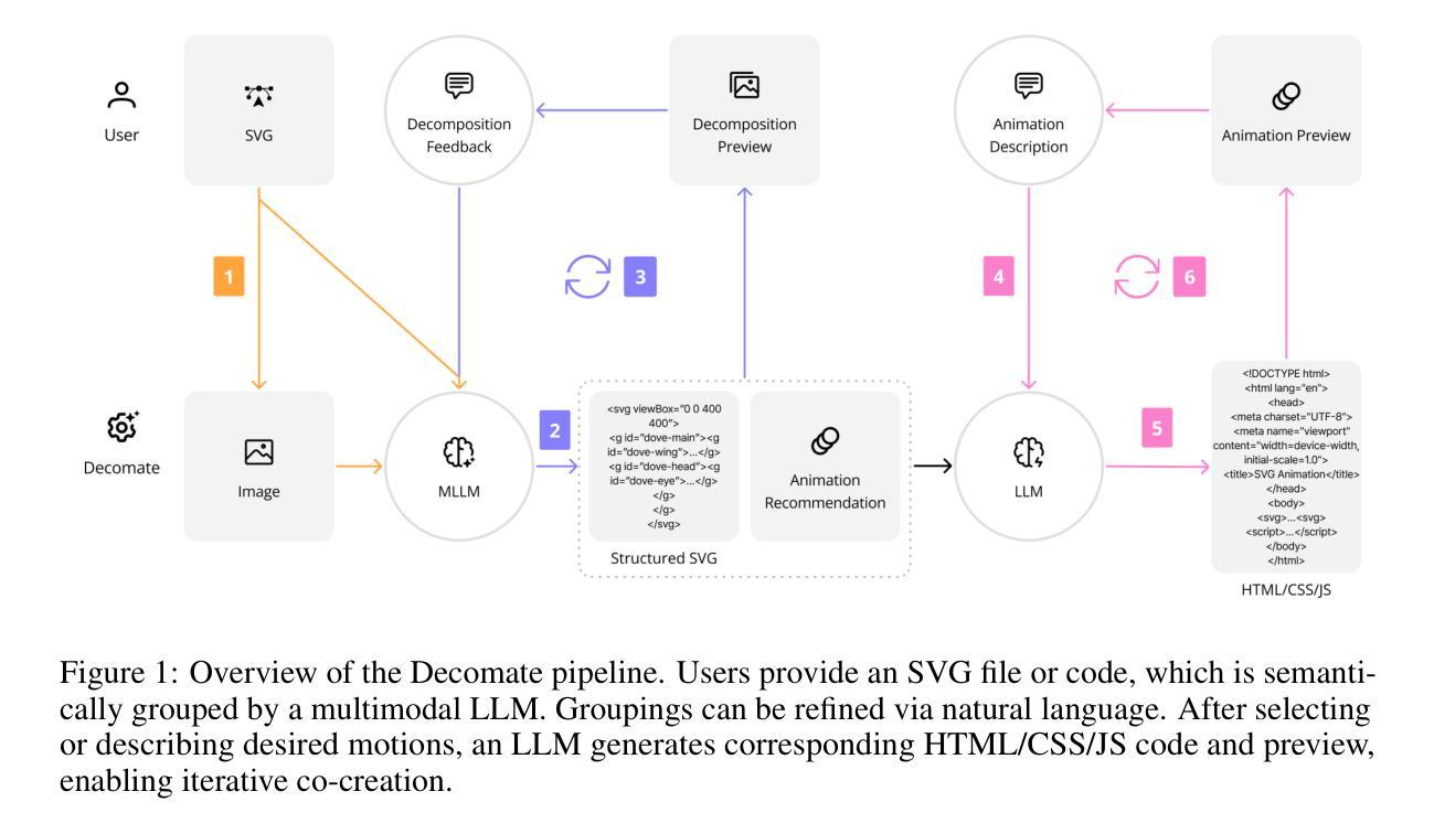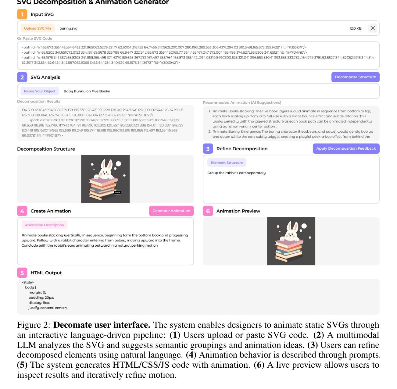 设计师在动画静态SVG图形时经常会遇到摩擦,特别是当视觉结构无法达到期望的运动细节水平时。现有工具通常依赖于预先定义的分组或需要专业技术知识,这限制了设计师独立进行实验和迭代的能力。我们推出Decomate系统,通过自然语言实现直观的SVG动画。Decomate利用多模态大型语言模型将原始SVG重组为语义上有意义、适合动画的组件。设计师随后可以通过文本提示为每个组件指定运动,系统生成相应的HTML/CSS/JS动画。通过支持通过自然语言交互进行迭代细化,Decomate将生成式人工智能集成到创意工作流程中,允许动画结果直接根据用户意图进行塑造。