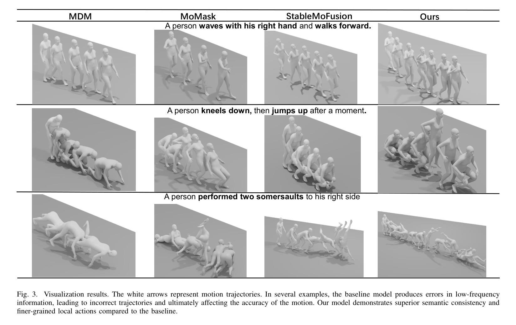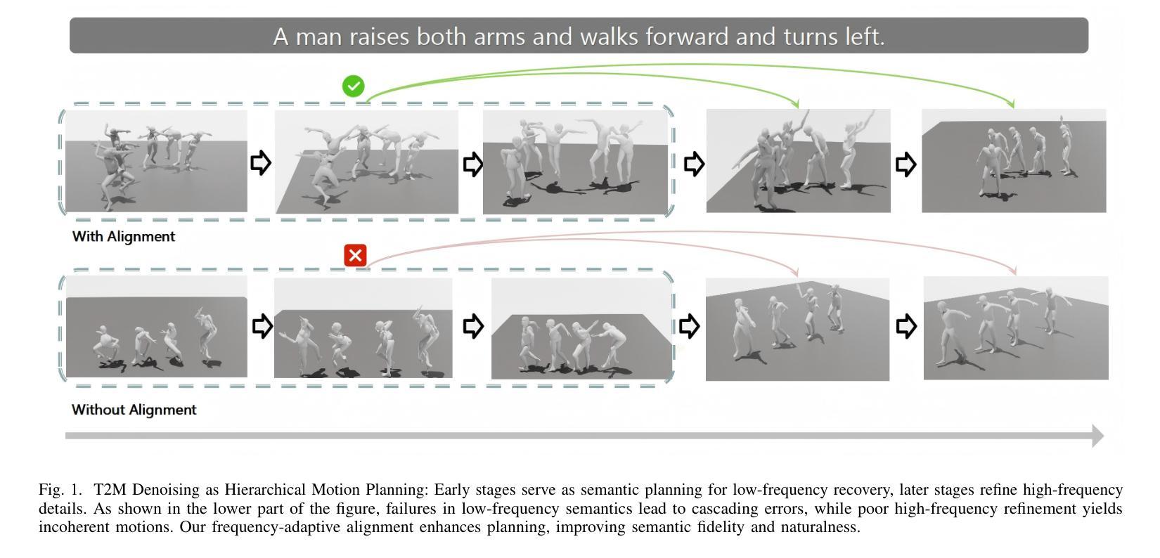 实现人形机器人从自然语言命令中合成复杂且物理连贯的动作,是自主机器人技术和人机交互的核心部分。尽管扩散模型在文本到动作(T2M)任务中显示出潜力,但它们通常会产生语义上有缺陷或不稳定的活动,限制了它们在真实世界机器人中的应用。本文从频域角度重新定义了T2M问题,发现生成过程反映了一种分层控制范式。我们确定了两个关键阶段:语义规划阶段,低频组件确定全局运动轨迹;精细执行阶段,高频细节完善运动。为了解决每个阶段的特定挑战,我们引入了频率增强文本到动作(Free-T2M)框架,该框架结合了阶段特定的频域一致性对齐。我们设计了一个频域时序自适应模块,以调节不同频带的对齐效果。这些设计增强了基础语义计划的稳健性,提高了详细执行的准确性。大量实验表明,我们的方法显著提高了运动质量和语义正确性。值得注意的是,当应用于StableMoFusion基线时,Free-T2M将FID从0.152降低到0.060,在扩散架构中建立了新的最先进的水平。这些发现强调了频域洞察力对于生成稳健和可靠运动的关键作用,为人形机器人更直观的自然语言控制铺平了道路。