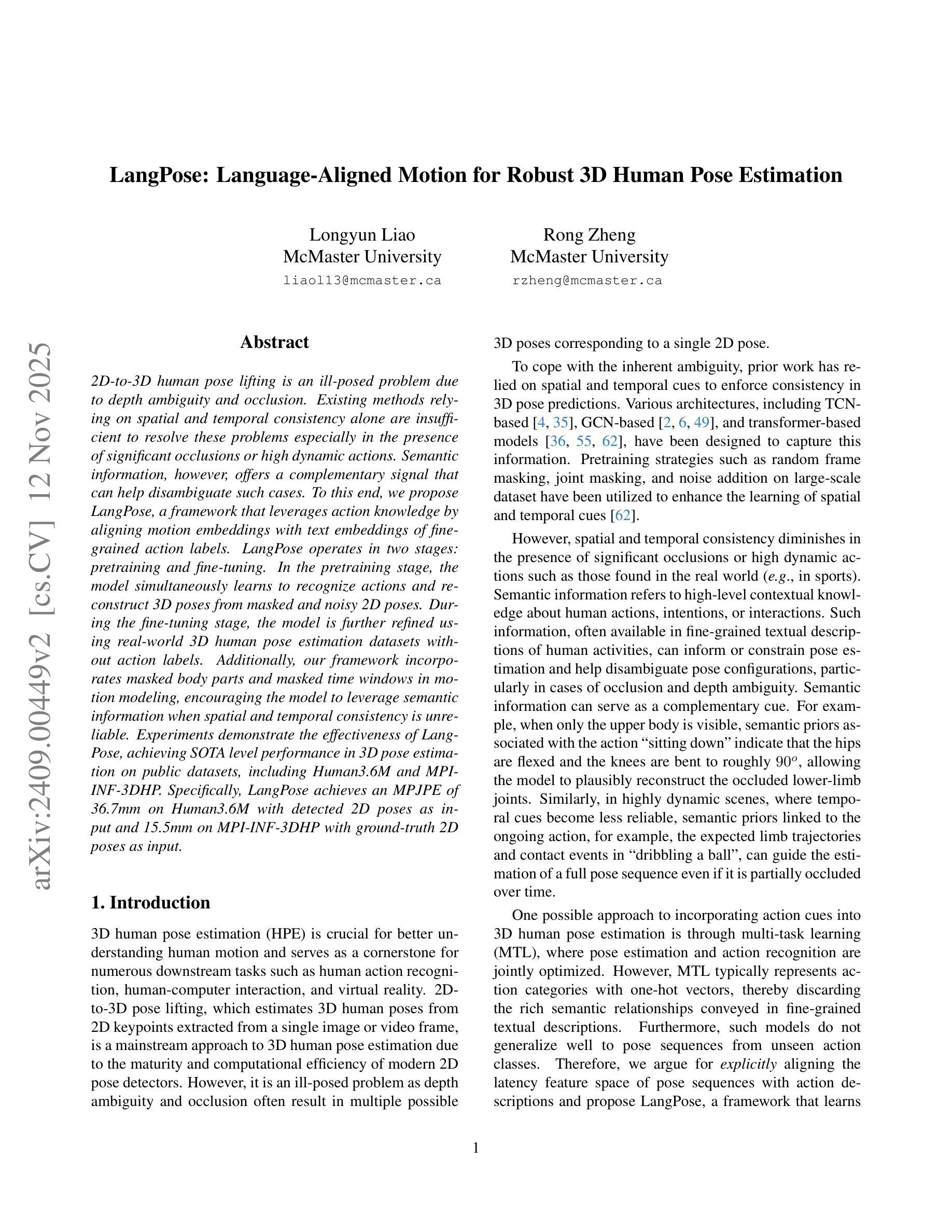 - LangPose框架通过结合动作知识,利用运动嵌入与精细动作标签文本嵌入的对齐来辅助解决这些问题。