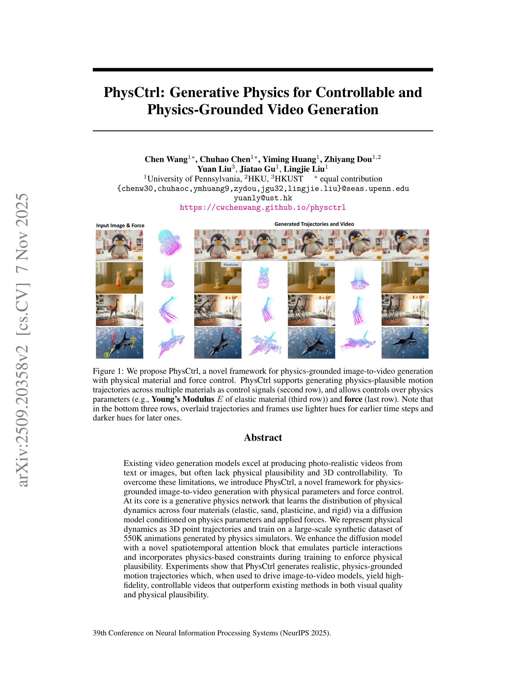 现有视频生成模型擅长从文本或图像生成逼真的视频,但往往缺乏物理合理性和3D可控性。为了克服这些限制,我们引入了PhysCtrl,这是一个基于物理参数和力控制的新型图像到视频生成框架。其核心是一个生成物理网络,通过扩散模型学习四种材料(弹性、沙子、可塑性材料和刚性)的物理动力学分布,该模型以物理参数和应用力为条件。我们将物理动力学表示为3D点轨迹,并在由物理模拟器生成的大规模合成数据集(55万个动画)上进行训练。我们增强扩散模型,加入新型时空注意力模块,模拟粒子交互并在训练过程中引入基于物理的约束,以强制执行物理合理性。实验表明,PhysCtrl生成真实的、基于物理的运动轨迹,当用于驱动图像到视频模型时,可生成高质量、可控的视频,在视觉质量和物理合理性方面均优于现有方法。项目页面:https://cwchenwang.github.io/physctrl