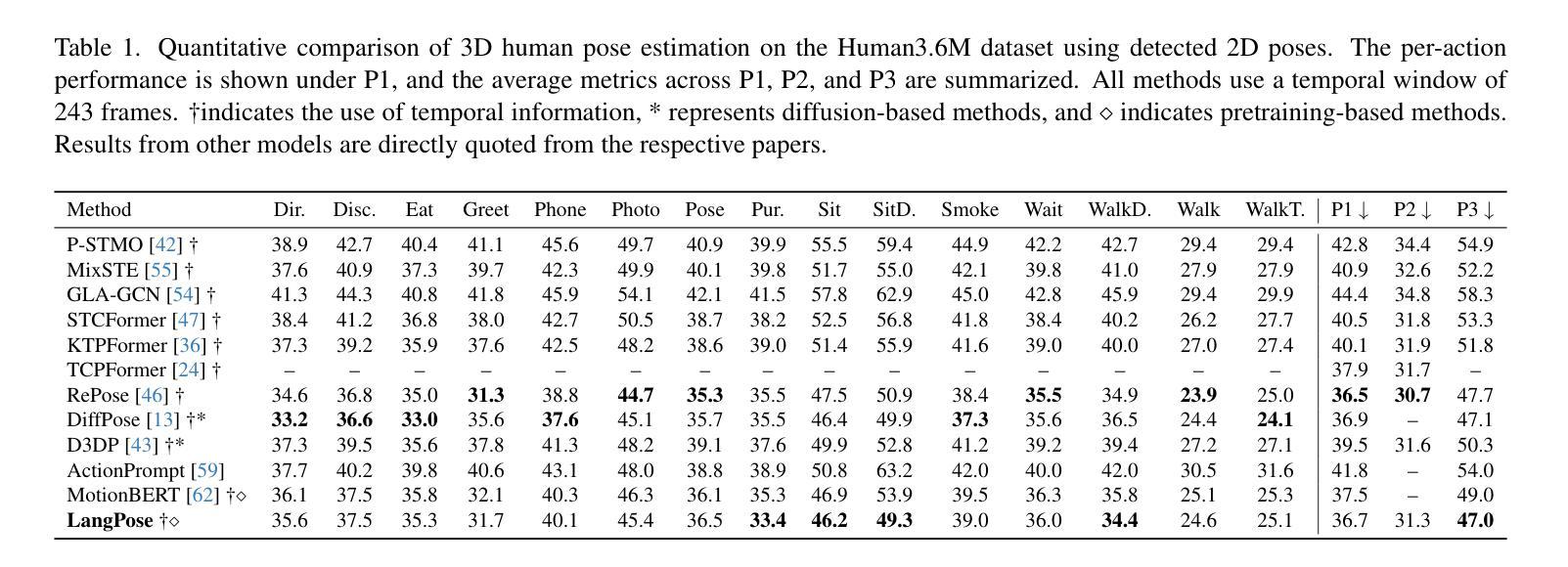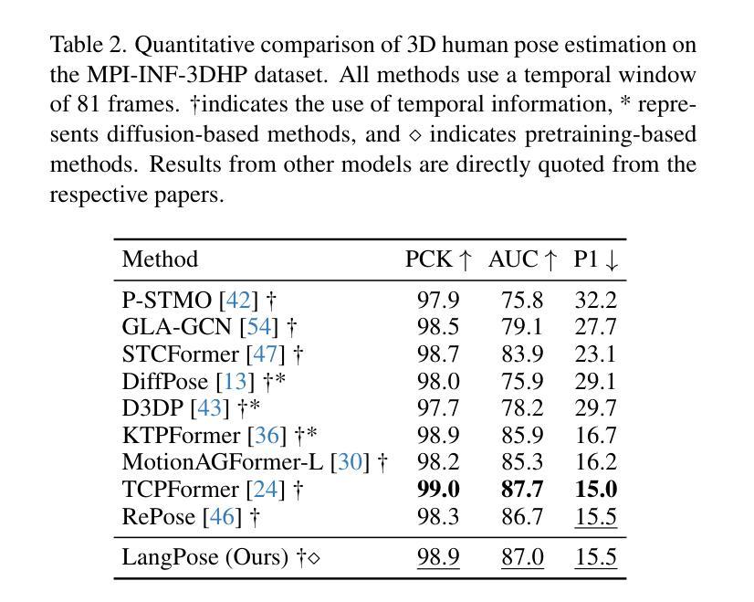 - 实验表明,LangPose在公共数据集上的三维姿态估计性能达到先进水平,如Human3.6M和MPI-INF-3DHP数据集。