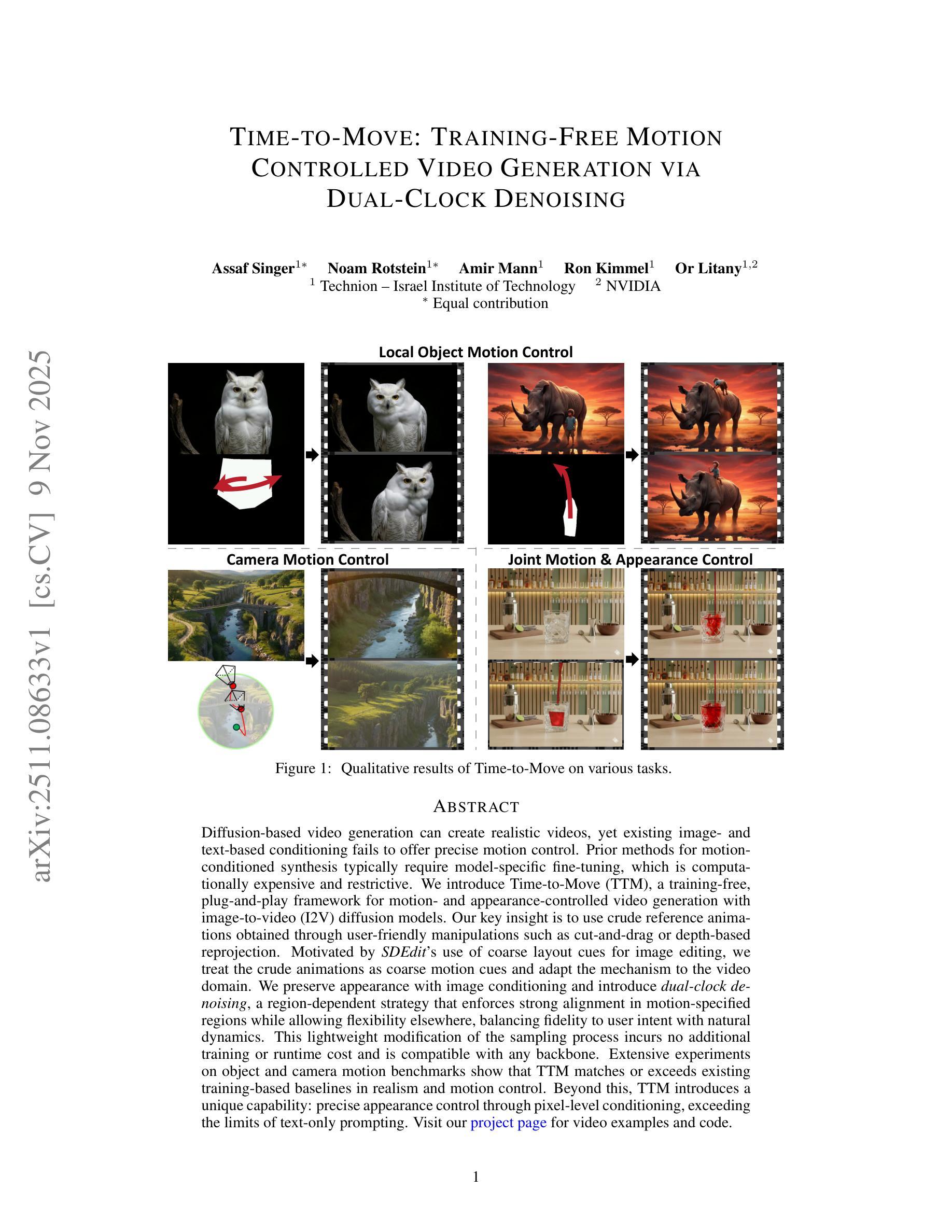 Diffusion-based video generation can create realistic videos, yet existing image- and text-based conditioning fails to offer precise motion control. Prior methods for motion-conditioned synthesis typically require model-specific fine-tuning, which is computationally expensive and restrictive. We introduce Time-to-Move (TTM), a training-free, plug-and-play framework for motion- and appearance-controlled video generation with image-to-video (I2V) diffusion models. Our key insight is to use crude reference animations obtained through user-friendly manipulations such as cut-and-drag or depth-based reprojection. Motivated by SDEdit’s use of coarse layout cues for image editing, we treat the crude animations as coarse motion cues and adapt the mechanism to the video domain. We preserve appearance with image conditioning and introduce dual-clock denoising, a region-dependent strategy that enforces strong alignment in motion-specified regions while allowing flexibility elsewhere, balancing fidelity to user intent with natural dynamics. This lightweight modification of the sampling process incurs no additional training or runtime cost and is compatible with any backbone. Extensive experiments on object and camera motion benchmarks show that TTM matches or exceeds existing training-based baselines in realism and motion control. Beyond this, TTM introduces a unique capability: precise appearance control through pixel-level conditioning, exceeding the limits of text-only prompting. Visit our project page for video examples and code: https://time-to-move.github.io/.
