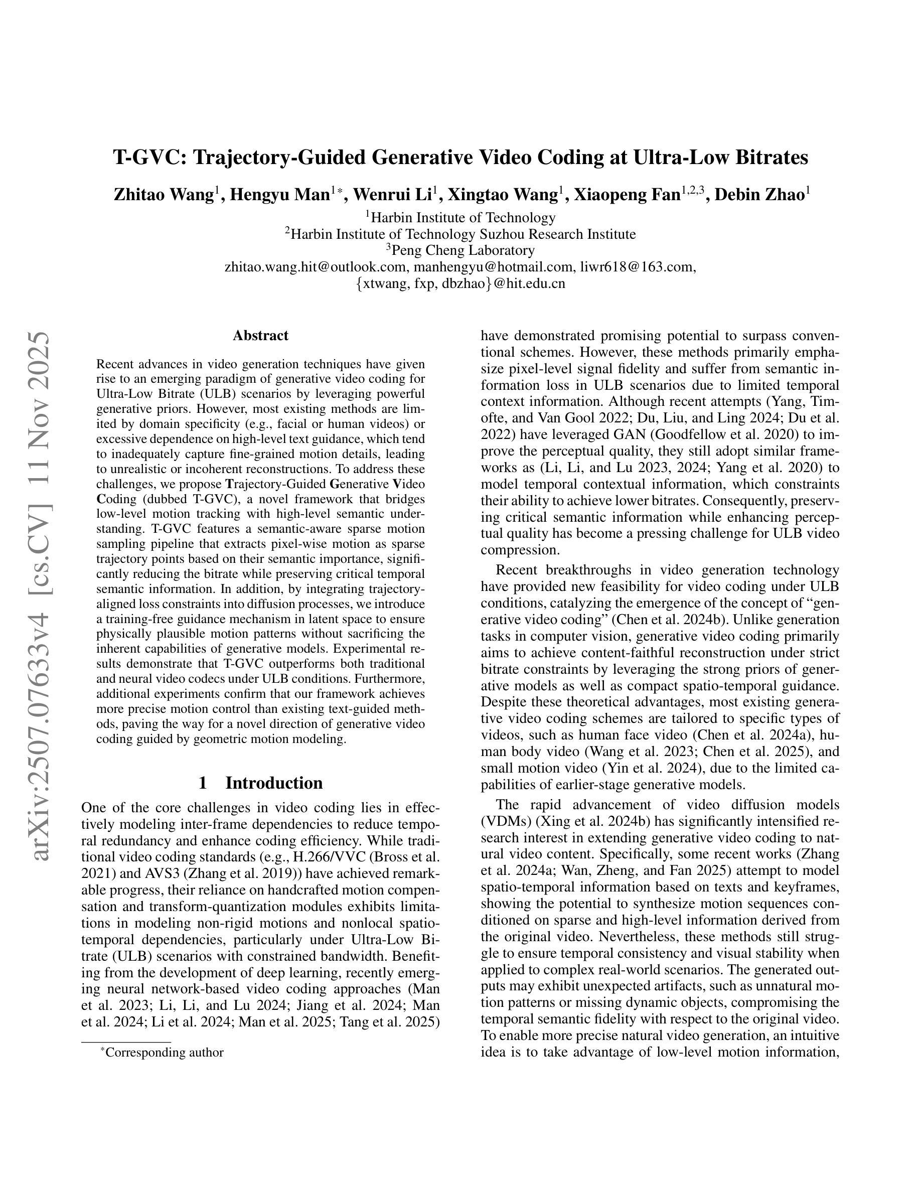 近期视频生成技术的进展为超低比特率(ULB)场景的生成式视频编码提供了新的范例,它借助强大的生成先验信息。然而,大多数现有方法受到领域特定性(如面部或人体视频)的限制,或过于依赖高级文本指导,往往无法充分捕捉精细的运动细节,导致重建结果不真实或不一致。为了解决这些挑战,我们提出了轨迹引导生成式视频编码(简称T-GVC),这是一个新的框架,将低级别的运动跟踪与高级别的语义理解相结合。T-GVC采用语义感知稀疏运动采样管道,根据语义重要性提取像素级的运动作为稀疏轨迹点,在大幅降低比特率的同时保持关键的时间语义信息。此外,通过将轨迹对齐损失约束集成到扩散过程中,我们在潜在空间中引入了一种无训练指导机制,确保物理上可行的运动模式,同时不牺牲生成模型的内生能力。实验结果表明,在ULB条件下,T-GVC的性能优于传统和神经网络视频编码器。进一步的实验证实,我们的框架比现有的文本引导方法实现了更精确的运动控制,为生成式视频编码的几何运动建模指导方向开创了新的途径。