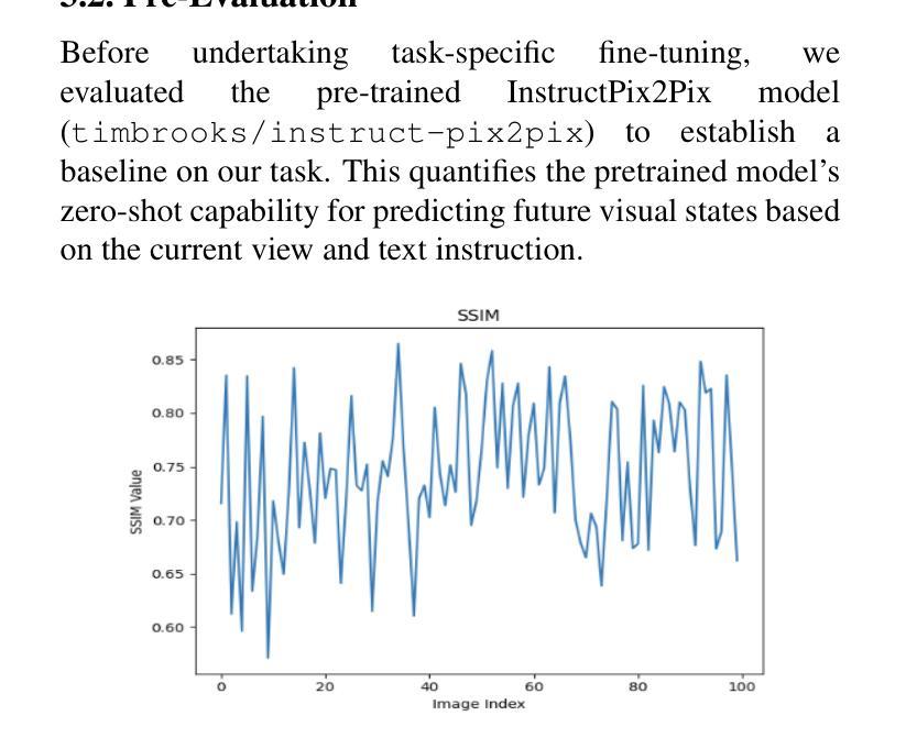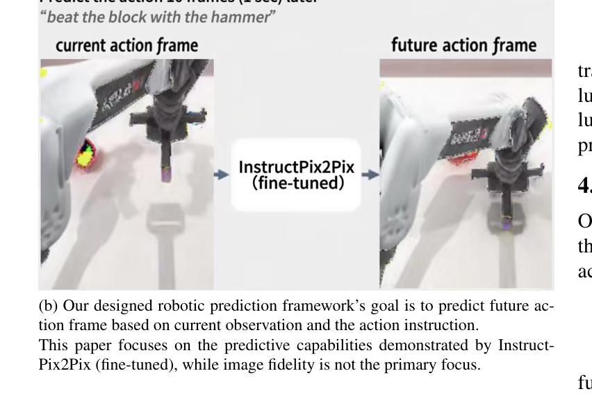预测未来运动轨迹是机器人技术、自主系统和人类活动预测等领域中的一项关键能力,能够为更安全、更智能的决策提供支撑。本文针对机器人动作预测提出了一种新颖、高效且轻量级的方法,相较于传统的视频预测模型,该方法大大减少了计算成本和推理延迟。更重要的是,它率先将InstructPix2Pix模型应用于机器人任务的未来视觉帧预测,扩展了其超越静态图像编辑的实用性。我们实现了一个基于深度学习的视觉预测框架,能够根据当前图像和文本指令预测机器人未来100帧(10秒)的观测情况。我们对InstructPix2Pix模型进行改造和微调,以接受视觉和文本输入,从而实现多模态未来帧预测。在RoboTWin数据集(基于真实场景生成)上的实验表明,我们的方法在机器人动作预测任务中实现了优于先进基准线的SSIM和PSNR指标。与传统的视频预测模型不同,这些模型需要多帧输入、大量计算和缓慢的推理延迟,而我们的方法只需要单个图像和文本提示作为输入。这种轻量级的设计实现了更快的推理速度、降低了GPU需求,并实现了灵活的多模态控制,对于机器人技术和运动轨迹分析等领域的应用特别有价值,在这些领域中,运动轨迹的精确度比视觉保真度更重要。