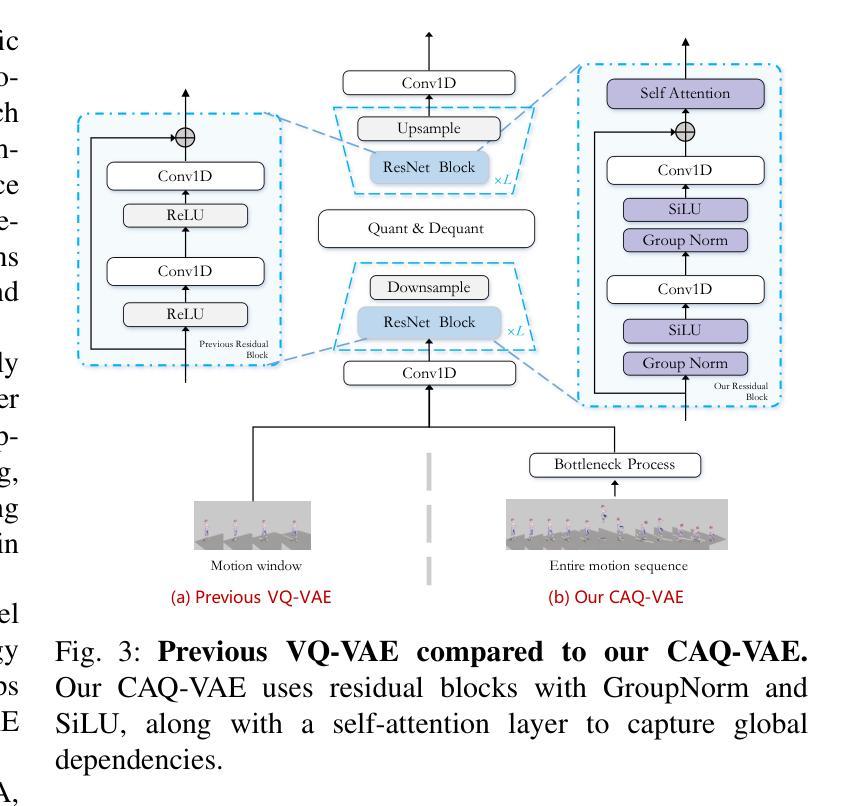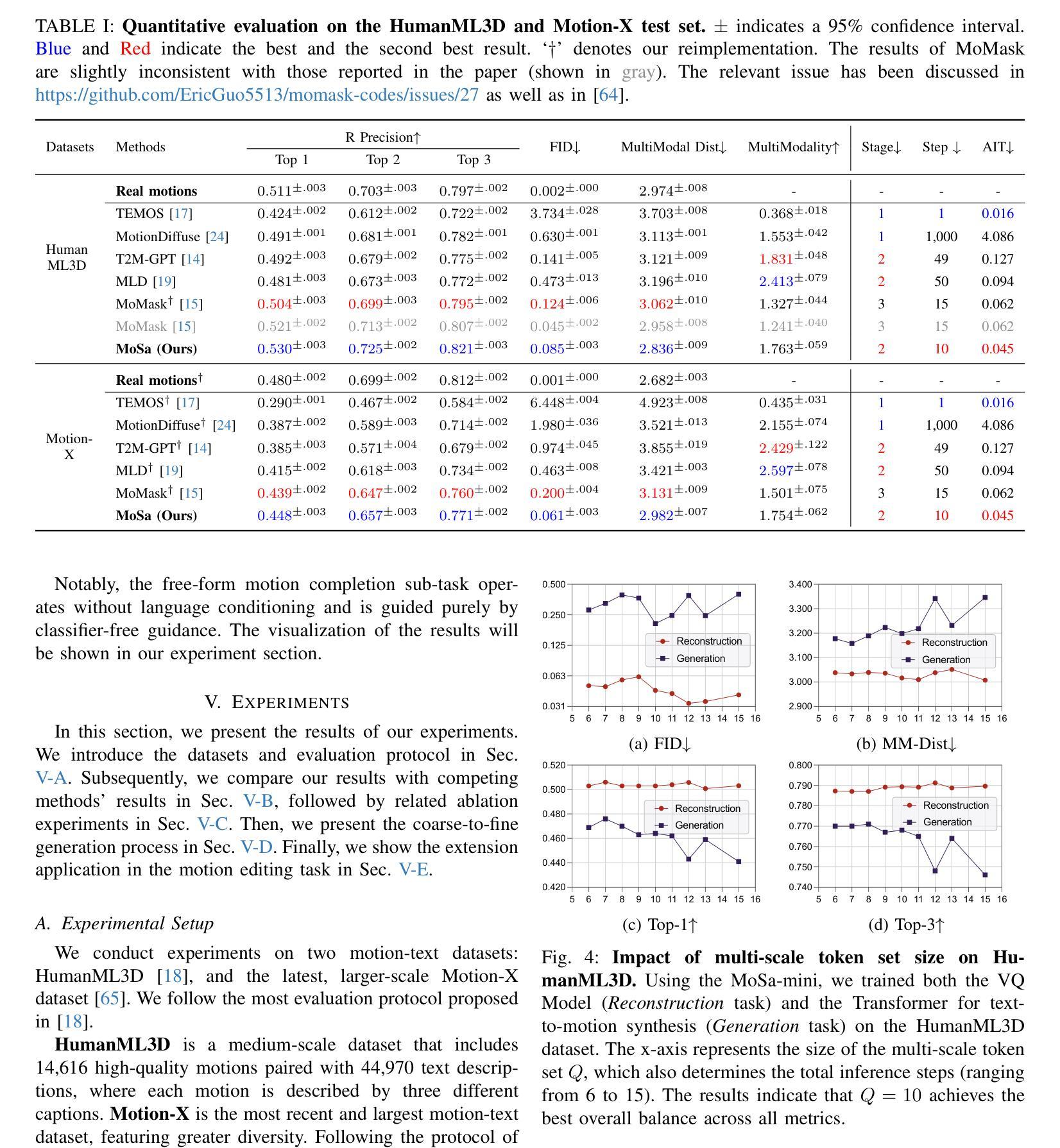 我们介绍了MoSa,这是一种用于文本驱动的三维人体运动生成的新型分层运动生成框架,它通过粗细可伸缩的生成过程增强了基于向量量化的生成式转换器(VQ-GT)范式。在MoSa中,我们提出了一种多尺度符号保留策略(MTPS),该策略被集成到分层剩余向量量化变分自编码器(RQ-VAE)中。MTPS在每个分层量化上采用插值,以有效地保留粗细多尺度符号。因此,生成式转换器支持可伸缩自回归(SAR)建模,该建模可以预测尺度符号,不同于传统方法在每个步骤中只预测一个符号。因此,MoSa仅需要10个推理步骤,与RQ-VAE量化层数相匹配。为了解决频繁插值可能导致的重建质量下降问题,我们提出了CAQ-VAE,这是一个轻便而表现力强混合卷积注意力VQ-VAE。CAQ-VAE增强了剩余块设计并融入了注意力机制,以更好地捕捉全局依赖性。大量实验表明,MoSa在生成质量和效率方面达到了最新水平,在保真度和速度方面都超越了以前的方法。在Motion-X数据集上,MoSa的FID为0.06(相比之下MoMask为0.20),同时推理时间减少了27%。此外,MoSa对于下游任务(如运动编辑)具有很好的通用性,无需进行任何额外的微调。相关代码可访问https://mosa-web.github.io/MoSa-web。