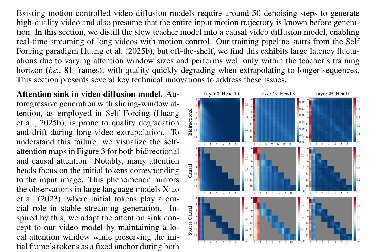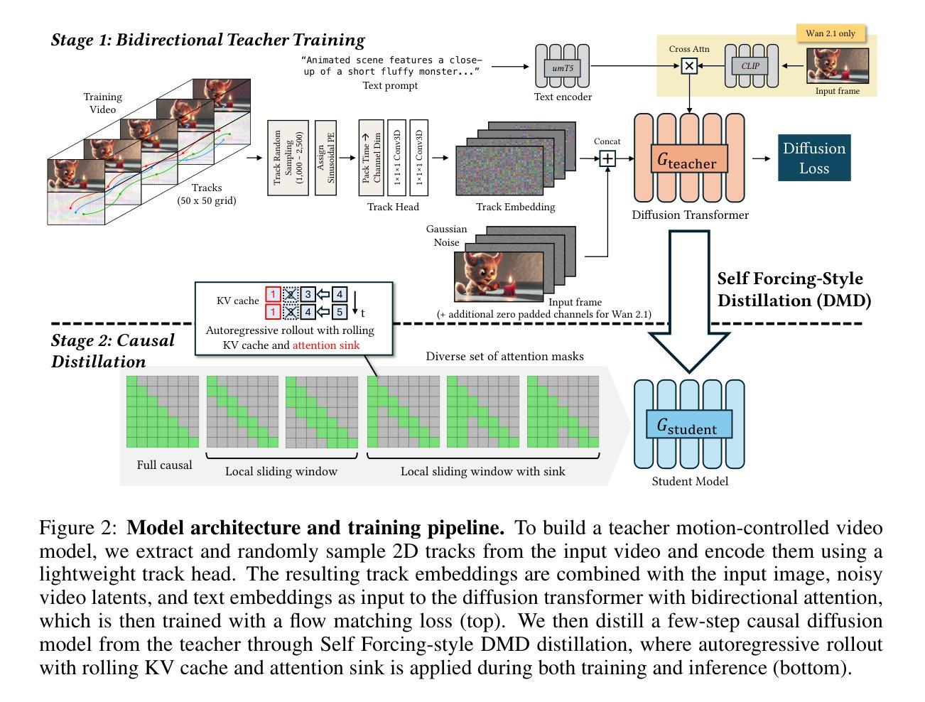 当前的运动条件视频生成方法存在延迟过大(每分钟输出一个视频)和非因果处理的问题,这阻止了实时交互。我们提出了MotionStream,使用单个GPU实现了子秒级延迟和高达29帧/秒的流式生成。我们的方法首先通过增强文本到视频模型的运动控制功能来生成高质量视频,这些视频遵循全局文本提示和局部运动指导,但不进行即时推理。因此,我们通过使用自我强迫和分布匹配蒸馏将双向教师提炼为因果学生,从而实现实时流式推理。在生成长时间甚至可能无限时间范围的视频时,会出现几个关键挑战:(1)弥合在有限长度上进行训练和在无限范围上进行推断之间的领域差距;(2)通过防止误差累积来维持高质量;(3)在不断增加的上下文窗口导致的计算成本不增加的情况下,保持快速推理。我们的方法的关键在于引入精心设计滑动窗口因果注意力,并结合注意力汇点。通过结合训练过程中的注意力汇点和KV缓存滚动,我们能够在固定上下文窗口内适当地模拟推理时间外推,从而实现任意长度视频的恒定速度生成。我们的模型在运动跟随和视频质量方面达到了业界最佳水平,同时速度提高了两个数量级,能够实现独一无二的无限制长度流式传输。使用MotionStream,用户可以在实时涂鸦轨迹、控制摄像头或转移运动,并实时看到结果呈现,提供真正的交互式体验。